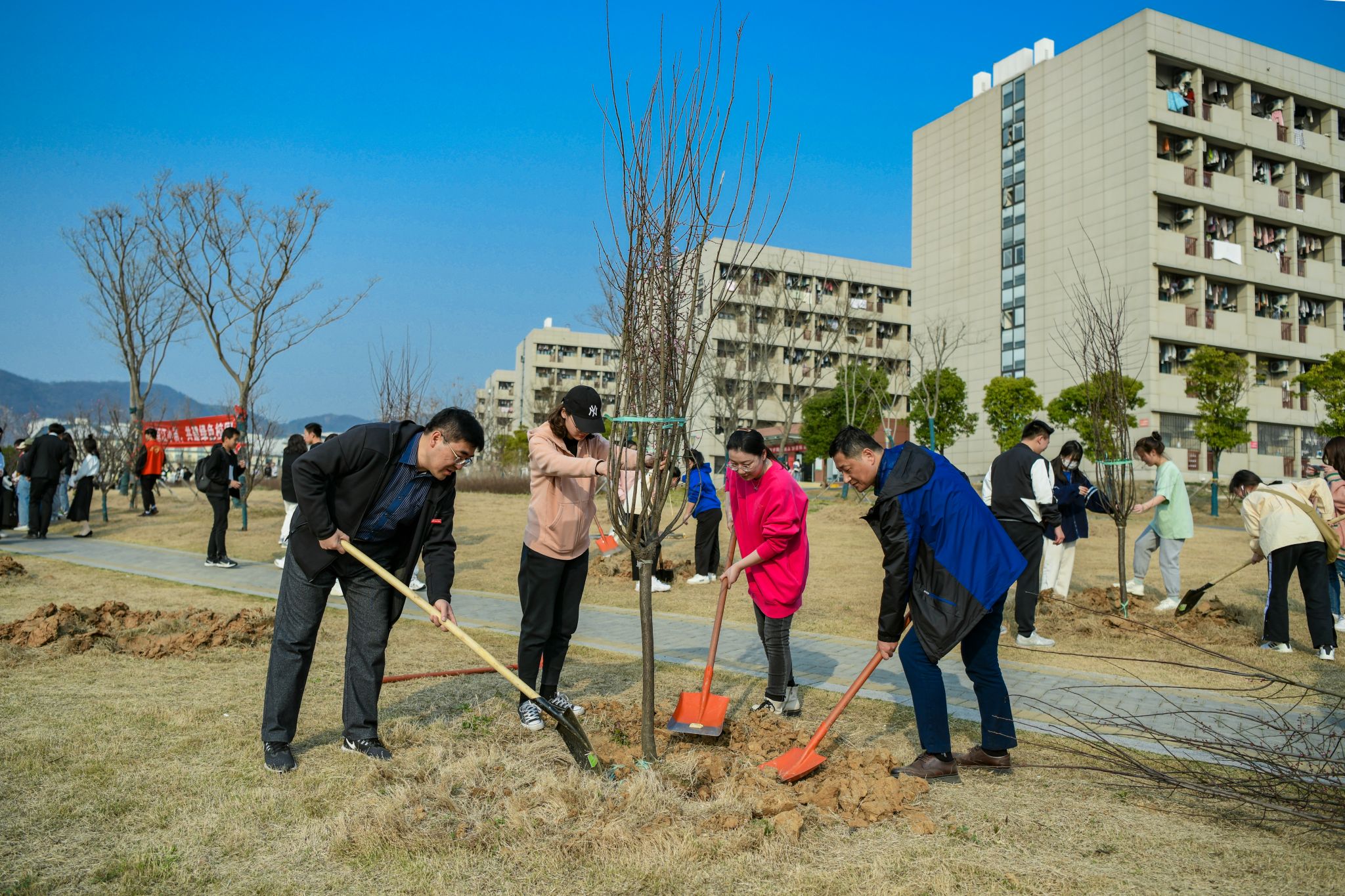 During the activity, the students planted plum blossom saplings together with the leaders of the college. Several people cooperated with each other to plant, and water seedlings. Every sapling, every drop of sweat and every shovel of soil show the enthusiasm of teachers and students and add a bright color to the campus in spring.