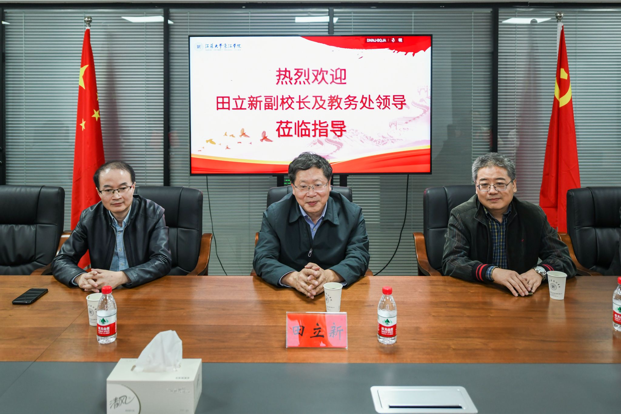 On the afternoon of October 20th, Tian Lixin, vice president of Jiangsu University, and other faculty came to our college for research and guidance. Zhao Xicang, the president of our college, Wang Guolin, the vice president, and the heads of relevant functional departments attended the meeting. The meeting was chaired by Wang Guolin.