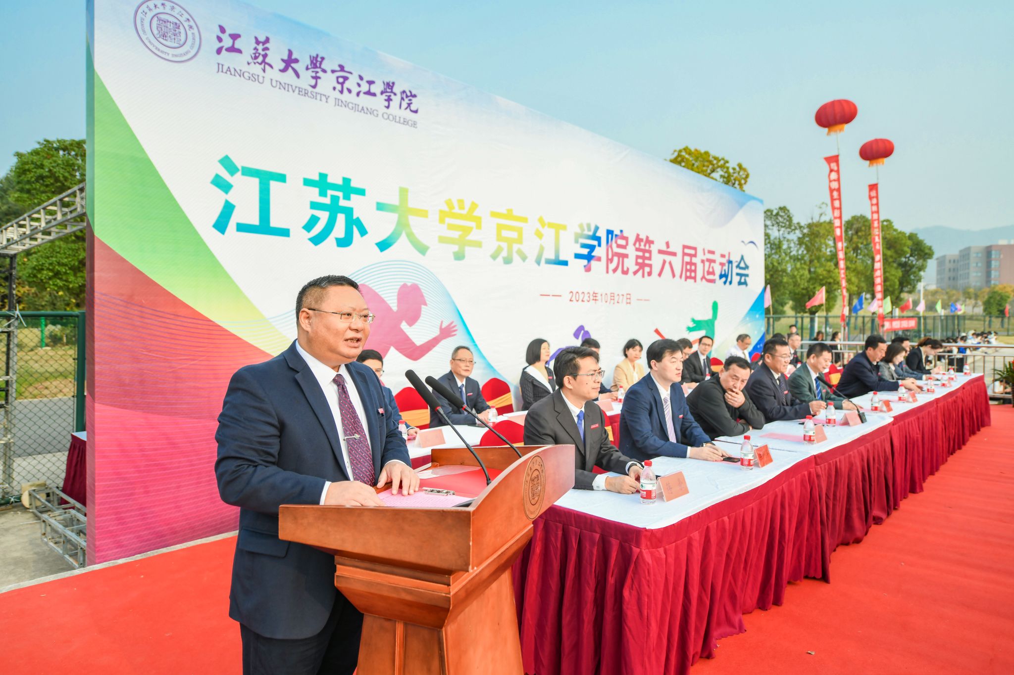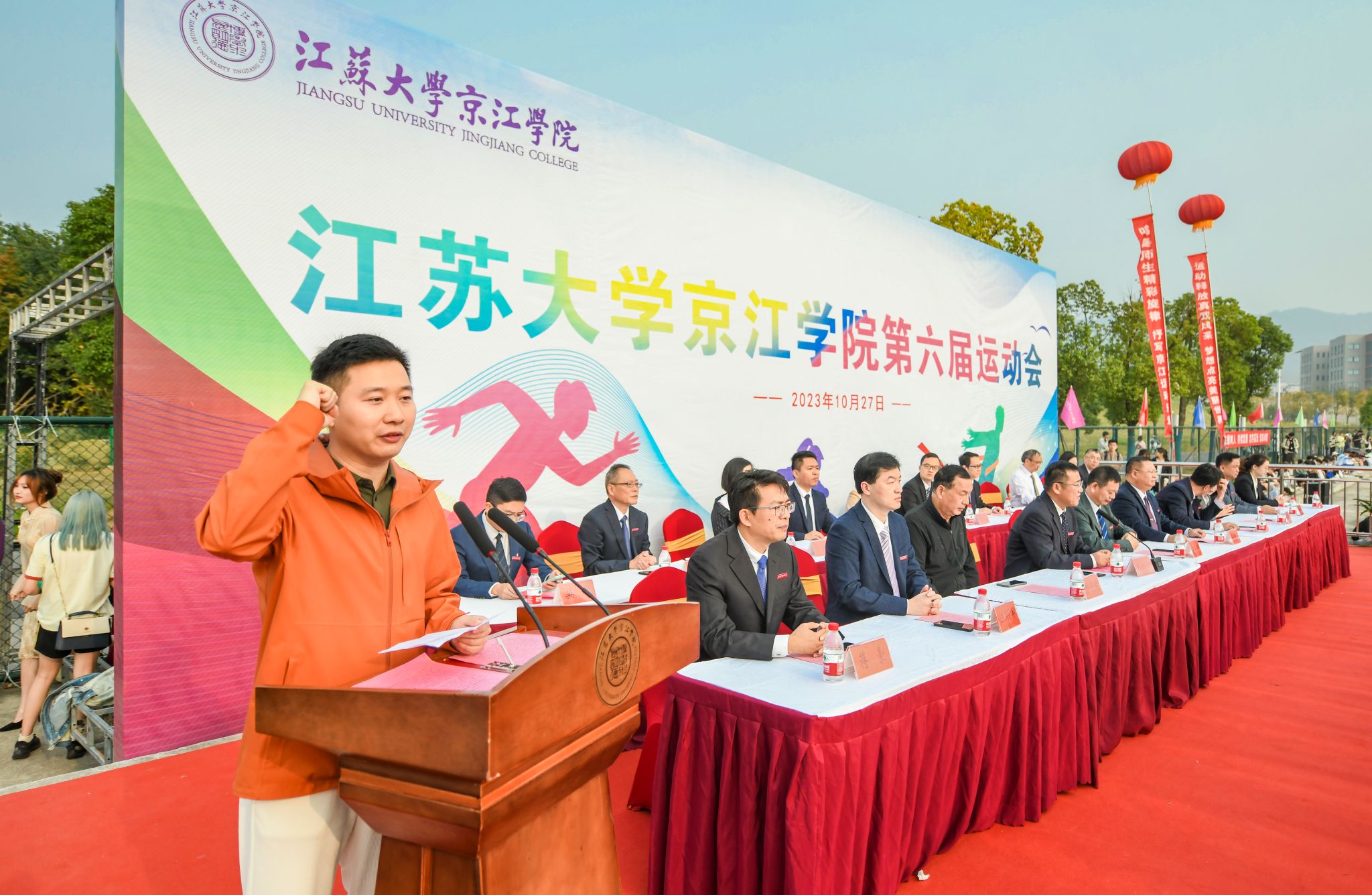 Cui Jingui announced the opening of the 6th Sports Meeting of Jingjiang College of Jiangsu University.