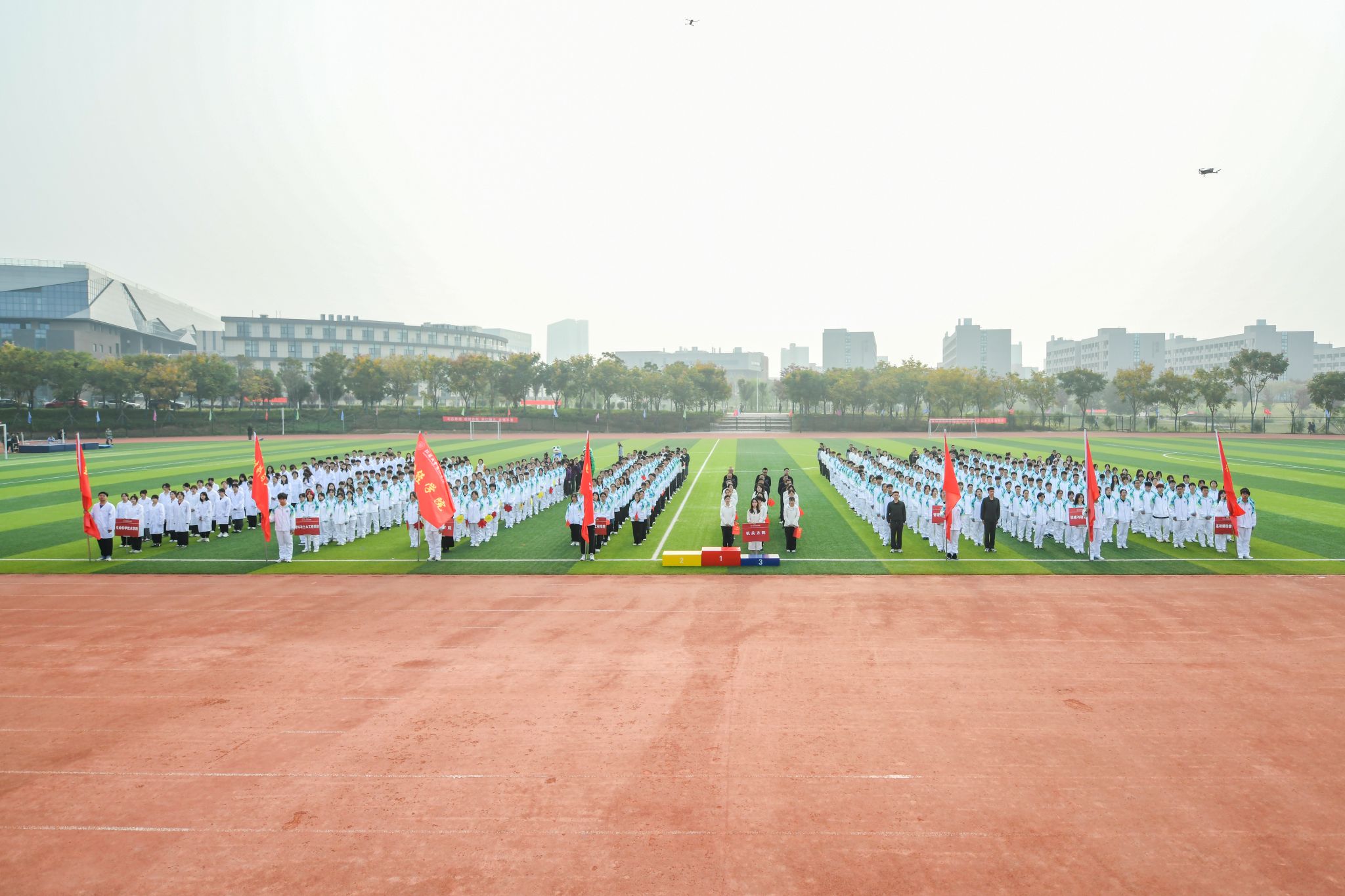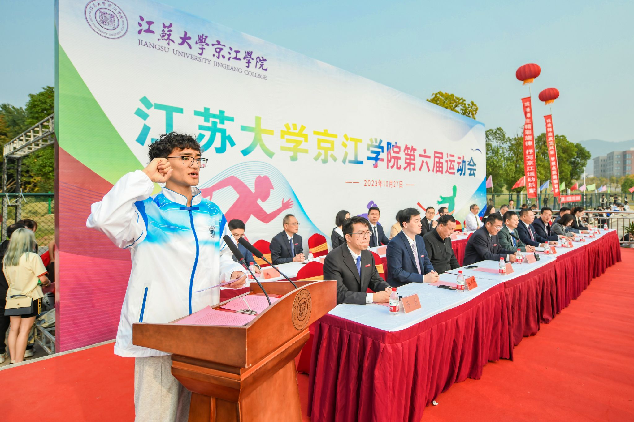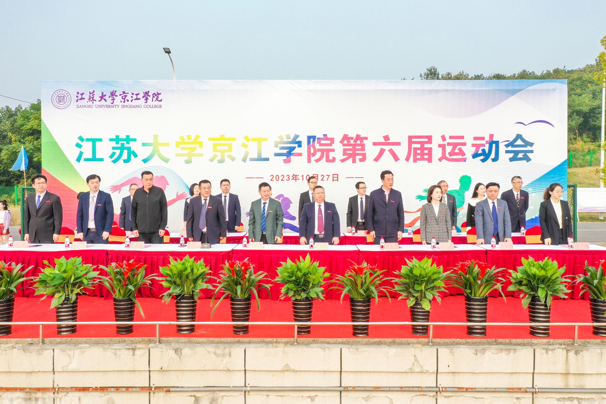 On October 27th, Our school held the 6th Sports Meeting in the track and field of Changshan Campus of Jiangsu University. Cui Jingui, Secretary of the Party Committee of our school, Du Daolin, Vice Presidents Fan Yanhua, Chen Mingjun, Deputy Director of the Sports Department of Jiangsu University Li Zongtang, former Deputy Director of the Sports Department of Jiangsu University Bian Kangrong attended the opening ceremony, heads of functional departments of our school, teachers and students of secondary colleges, all participants and all referees attended the opening ceremony. The opening ceremony was presided over by Vice President Wang Guolin.