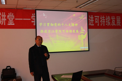 In order to deeply study, comprehend and implement the spirits of the 18thNational Congress of the Communist Party of China, push the scientific development of college career, Jingjiang College held the Secretary Lecture at 2pm, Nov. 28th, in which, Professor Chen Zhigang, the party secretary of the college, made a special presentation and report to the faculties of the college on "learning and implementing the spirits of 18thParty Congress, and promoting the sustainable development of Jingjiang College".