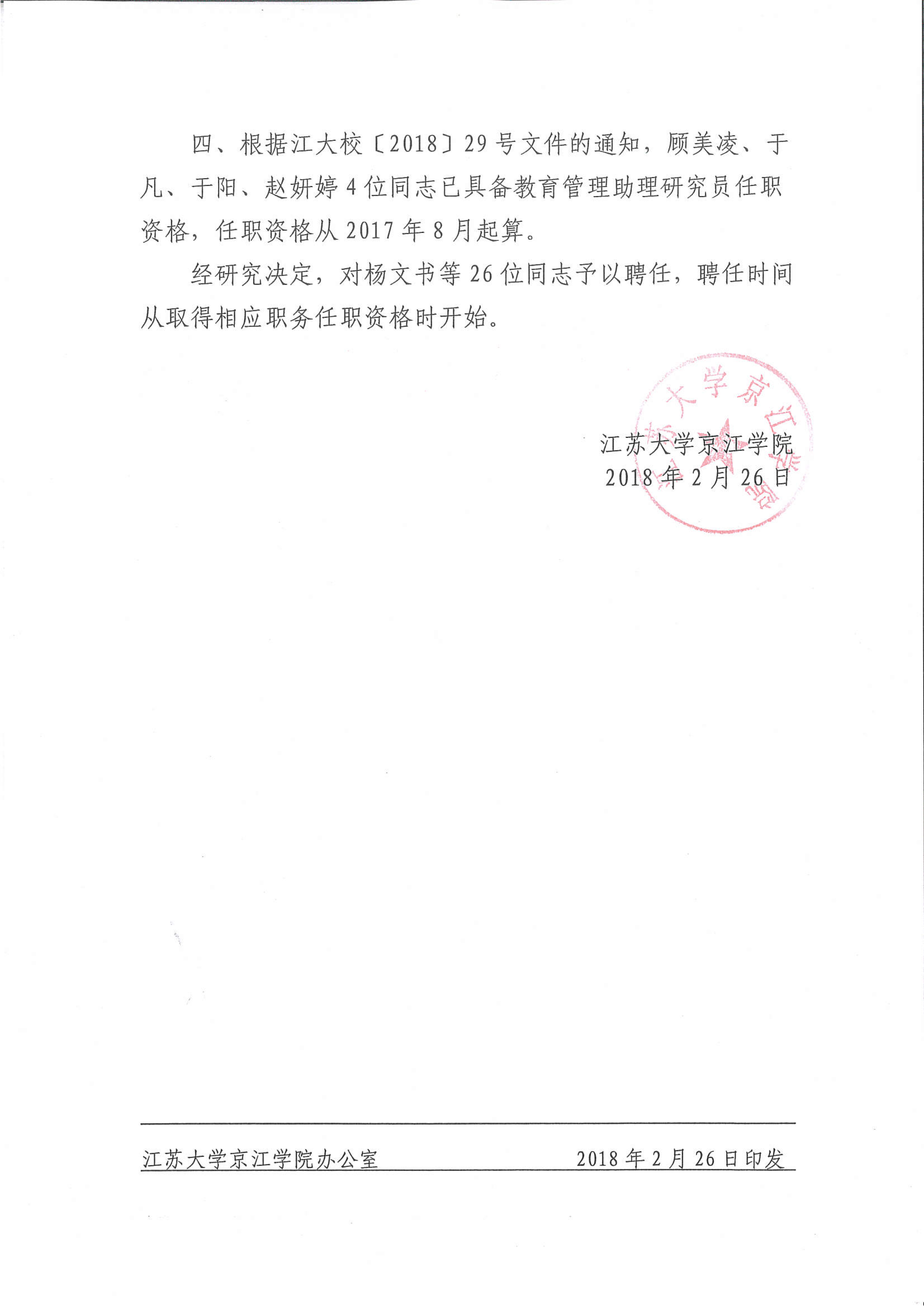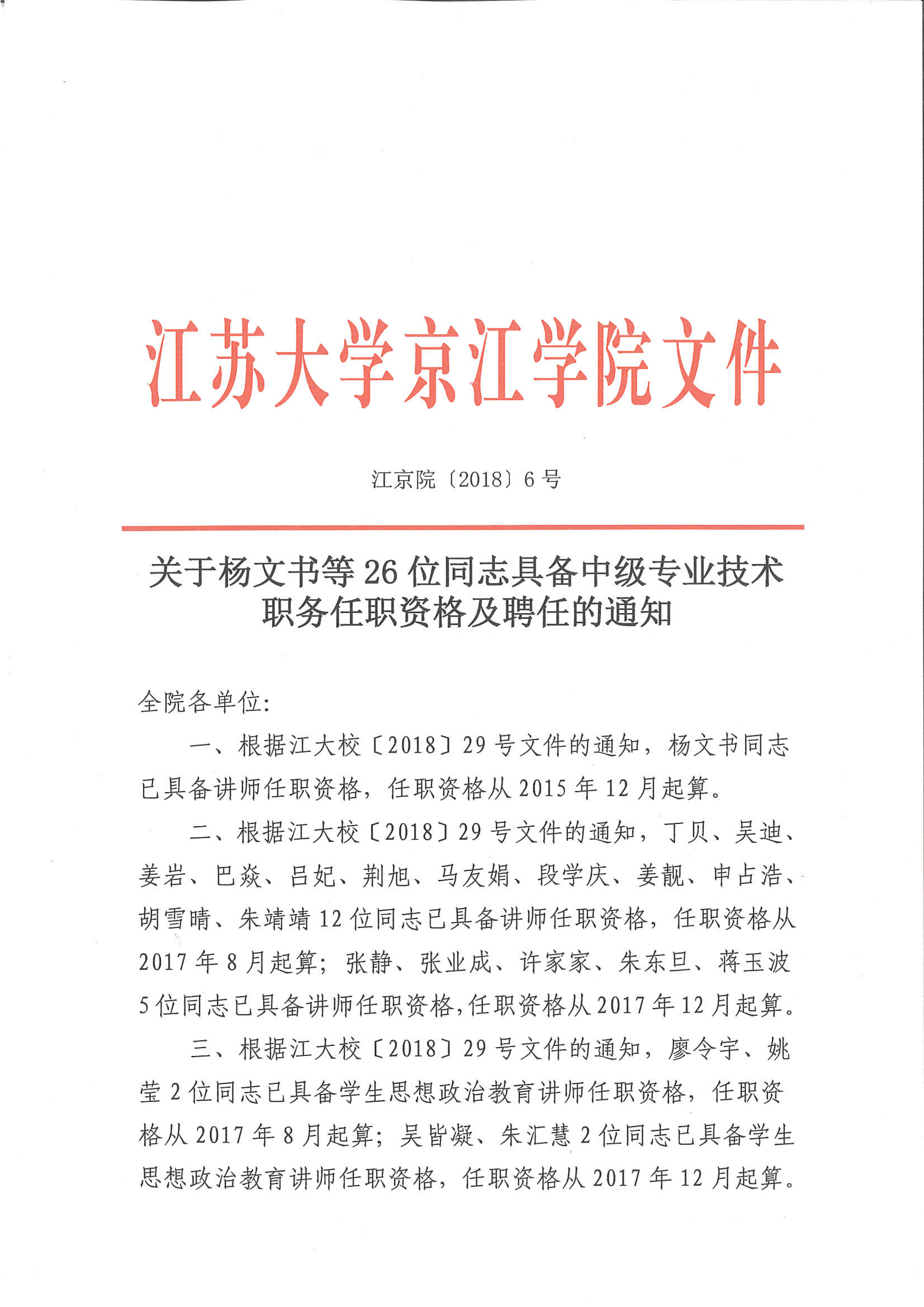 关于杨文书等26位同志具备中级专业技术职务任职资格及聘任的通知