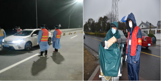 J机械(专升本)1702谈俊杰(左图),J机械1603金裕民(右图),均为中共预备党员。主动加入当地志愿者队伍,负责看守卡口,拦截外来车辆人员,测量体温,登记往返者信息及做好劝返工作。