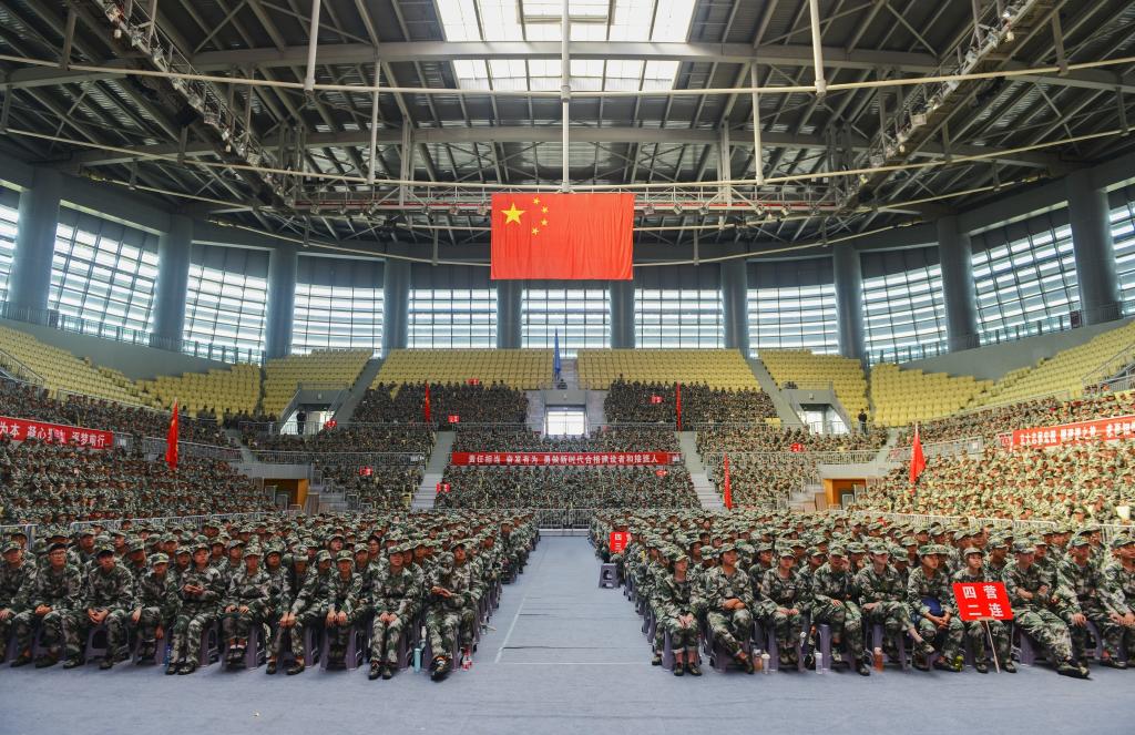 “百灵鸟从蓝天飞过……”伴随着空灵悠扬的歌声,一场“突如其来”的快闪迅速感染了全场师生,现场2000多名新生身着迷彩服,大家齐声歌唱《我爱你中国》。今年恰逢中华人民共和国成立七十周年,我院师生以爱国爱党的赤胆忠诚和积极向上的精神风貌表达了对祖国母亲的真挚热爱与殷殷祝福。