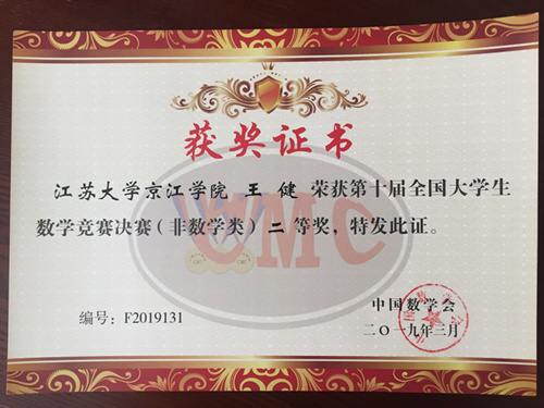 第十届全国大学生数学竞赛决赛结果近日揭晓,我院学生王健(15级软件工程)在决赛中脱颖而出喜获非数学专业组二等奖。王健是从去年10月初赛的十一万余人中胜出的选手,而且参加非数学类决赛的江苏仅有17名。在北大、清华、中科大等名校学生同样参赛的决赛中,王健同学发挥出色,取得优异成绩,充分展示了我院学子的风采,为学院赢得了荣誉。这也是我院在此项赛事中首次闯入决赛并取得好成绩。