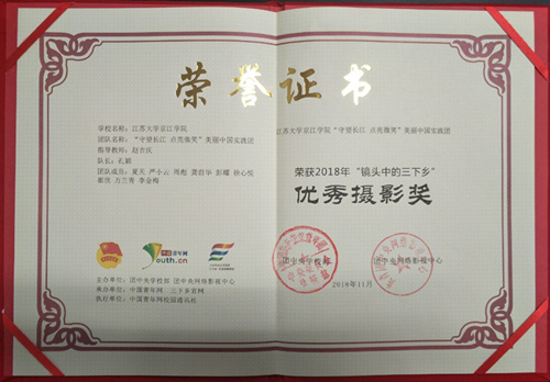 2018年12月19日,“2018年镜头中的三下乡”总结大会在对外经济贸易大学举行,此次活动由团中央青年发展部、团中央网络影视中心主办。我院“守望长江 点亮微笑”美丽中国实践团队荣获2018年“镜头中的三下乡”优秀摄影奖。