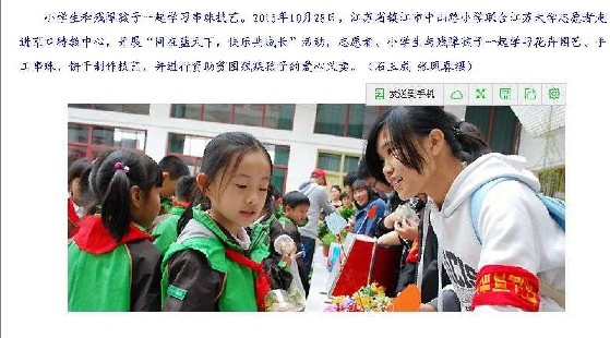 2015年10月28日,江苏大学京江学院志愿者走进京口特教中心,开展“同在蓝天下,快乐共成长”活动,志愿者、小学生与残障孩子一起学习花卉园艺、手工串珠、饼干制作技艺,并进行资助贫困残疾孩子的爱心义卖。