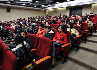 摄影展后,学院英语系学生与江苏大学非洲留学生在活泼友好的气氛下开展了中非文化交流会。在中方学生一曲南非世界杯主题曲《WAKAWAKA》的带动下,两国同学们载歌载舞争相斗艳,既分享了中国传统食物饺子和传统乐器古筝等,也欣赏了非洲土著舞蹈的热情奔放。
