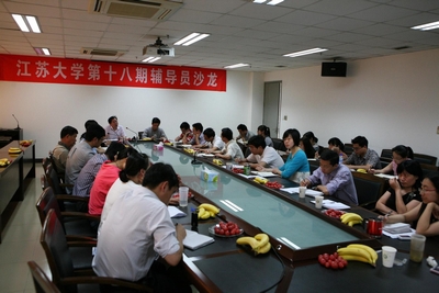 2011年5月18日下午,江苏大学第十八期辅导员沙龙在京江学院五楼会议室隆重举行,本次辅导员沙龙的主题是“辅导员工作目标和个人成长”,由江苏大学学工处主办,京江学院承办。江苏大学副书记\、副校长姚冠新教授,京江学院院长路正南教授,学工处处长助理付刚以及京江学院全体辅导员参加了此次研讨,活动由京江学院赵梅庆副书记主持。