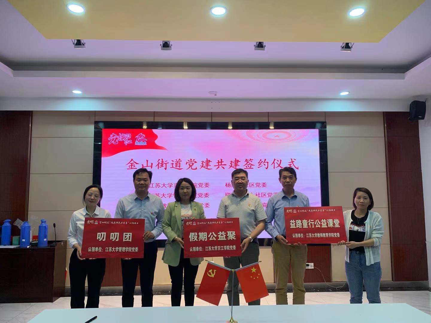 共建仪式上,金山街道党工委书记黄华良代表金山街道对京江学院、江苏大学管理学院和江苏大学教师教育学院对金山街道党建工作的支持表示衷心的感谢,并简要介绍了金山街道党建工作情况。随后,陈立勇等分别介绍了各自学院基本情况与党建工作情况。最后,黄华良与陈立勇等分别签订了党建共建合作协议,并分别认领了“假期公益聚”等党建共建项目。