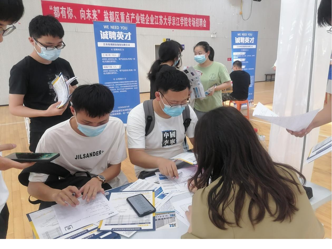 6月9日,我院在体育活动中心举办了“都有你、向未来”盐都区重点产业链企业江苏大学京江学院专场招聘会。此次招聘会涵盖了盐城市盐都区机械、电气、光电显示、印制电路板、智能视听三条重点产业链在内的20家优质企业参会,未现场参会的30家企业共提供了454个岗位需求,达成就业意向109人。