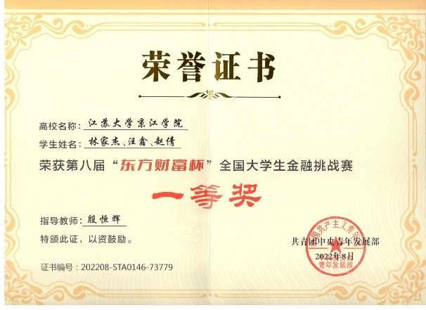 近日,我院管理与人文学院林家杰、汪鑫、赵倩三位学生组成的“铁甲小宝”队,经过四个月的激烈的角逐,荣获第八届全国大学生金融挑战赛国赛一等奖。