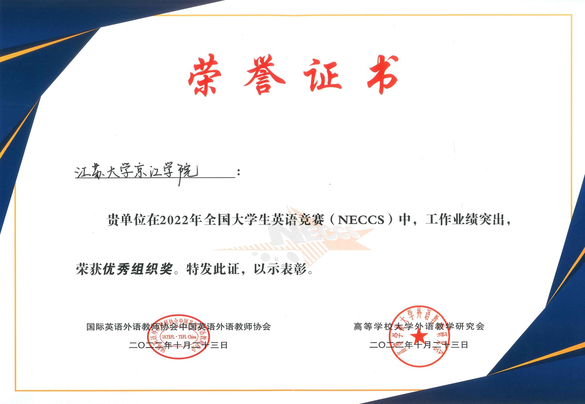 近日,2022年全国大学生英语竞赛(NECCS)全国总决赛落幕,我校荣获“优秀组织奖”,朱思衡、高瑞阳、朱昕怡等3位同学荣获全国C类(非英语专业)一等奖,基础课程教学部大学英语教研组王馥沁、吴珊、朱晨舒等三位教师荣获“优秀指导教师”荣誉称号,吴珊荣获个人 “优秀组织奖”。
