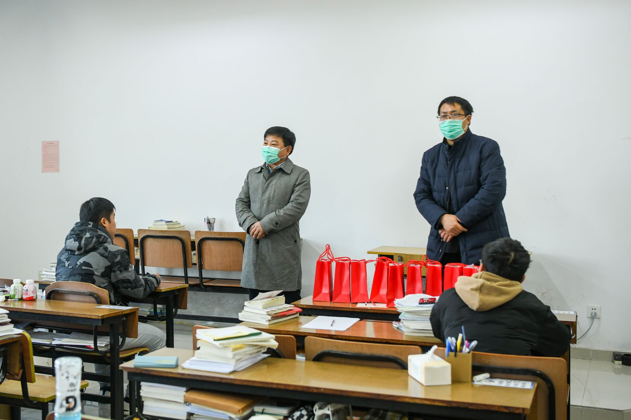 在考研教室,赵喜仓为在场的备考学生送上文具、口罩和餐券,关切询问学习和生活情况,叮嘱大家非常时期,也是关键时期,要做好疫情防护,注意休息、营养和健康。他勉励所有考研学生要以最坚定的信心、最稳定的心态、最沉着的应对、最有效的发挥完成考试,并预祝大家全部成功上岸。