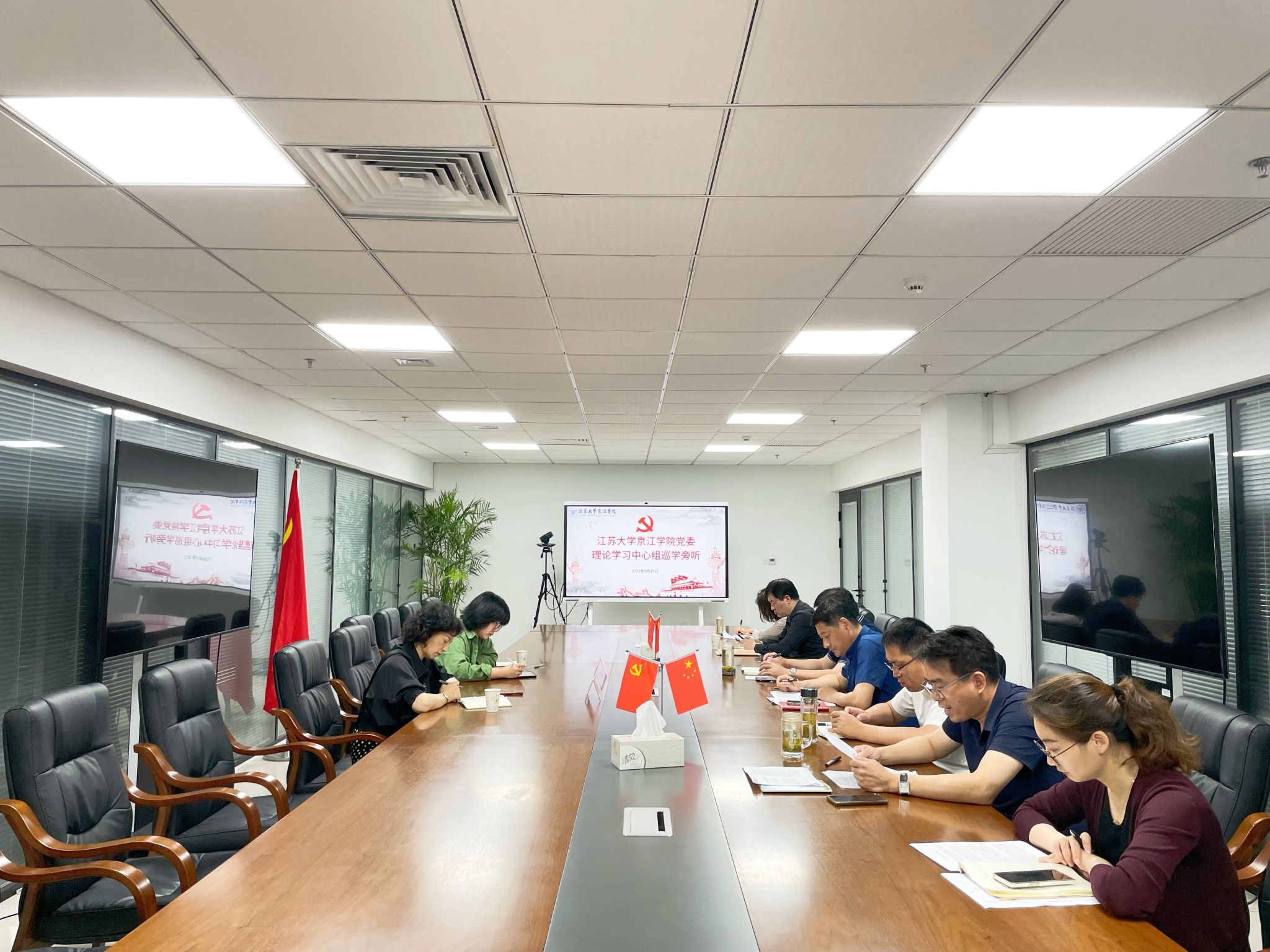 5月31日下午,京江学院党委理论学习中心组在行政楼302会议室召开“学习贯彻中国共产党第二十届中央纪律检查委员会第二次全体会议精神和习近平总书记关于全面从严治党的重要论述”专题学习会,京江学院党委书记尹志国主持会议。江苏大学土木工程与力学学院党委书记朱晏,电气信息工程学院党务办主任肖怡晨一行进行了巡学旁听。