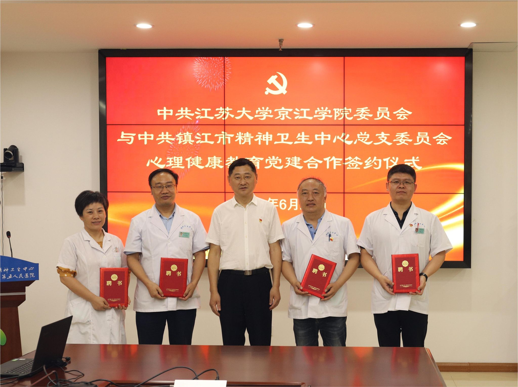 尹志国和曹卫东分别代表双方签订合作协议,就开辟“绿色通道”、心理危机干预、心理健康队伍建设、科研合作等方面达成一致。仪式上,尹志国为镇江市精神卫生中心老年精神科张长春、临床心理科汪周兵、儿少心理科魏燕、强制医疗科周军四位主任颁发“江苏大学京江学院心理健康教育中心顾问”证书。