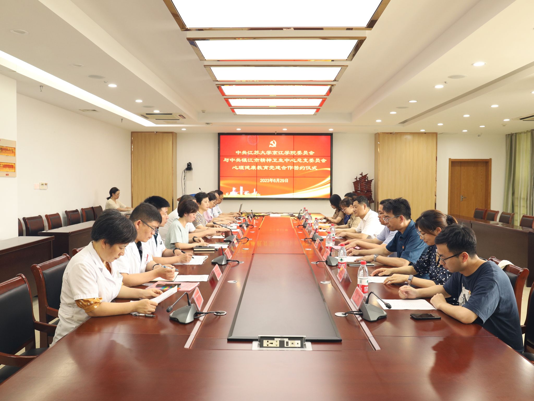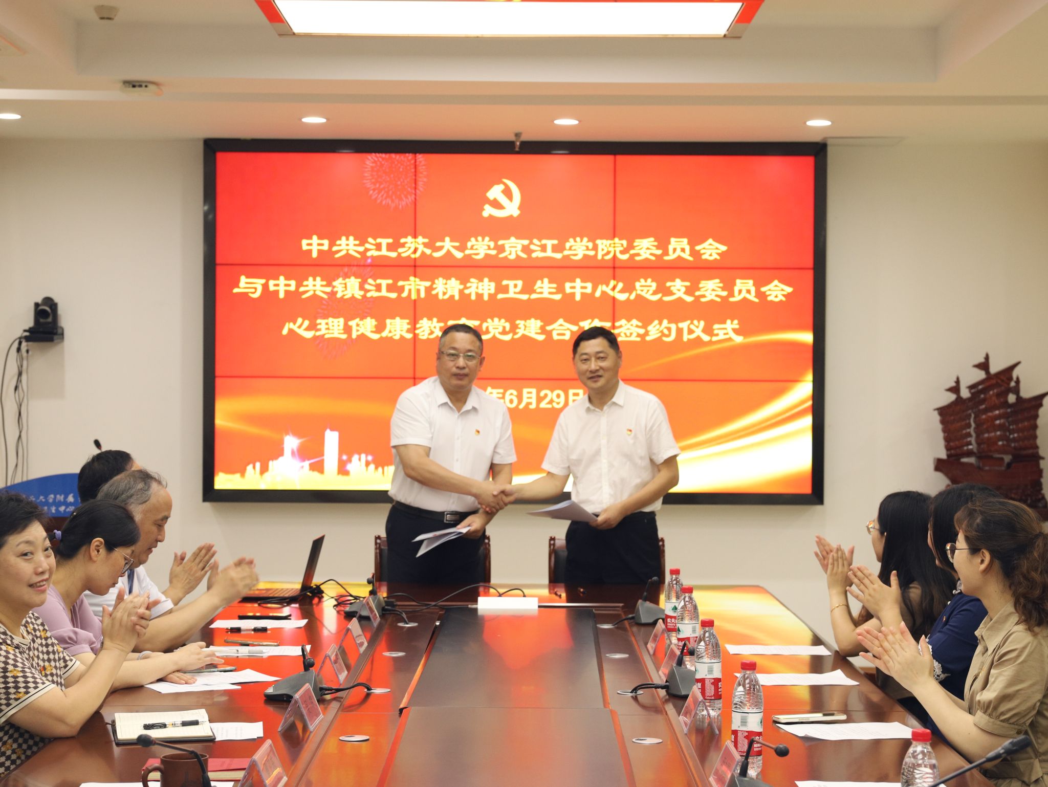 为贯彻落实教育部等十七部门联合印发的《全面加强和改进新时代学生心理健康工作专项行动计划(2023-2025)》要求,深入实施关爱青少年生命健康“润心”行动,探索医校共建校园心理健康新模式,6月29日,江苏大学京江学院与镇江市精神卫生中心心理健康教育医校党建合作签约仪式在精神卫生中心会议室举行。江苏大学京江学院党委书记尹志国,副书记、副院长吴立平及相关职能部门负责人和专职心理教师,镇江市精神卫生中心党总支书记曹卫东,副书记吴辉及相关科室主任参加了签约仪式。
