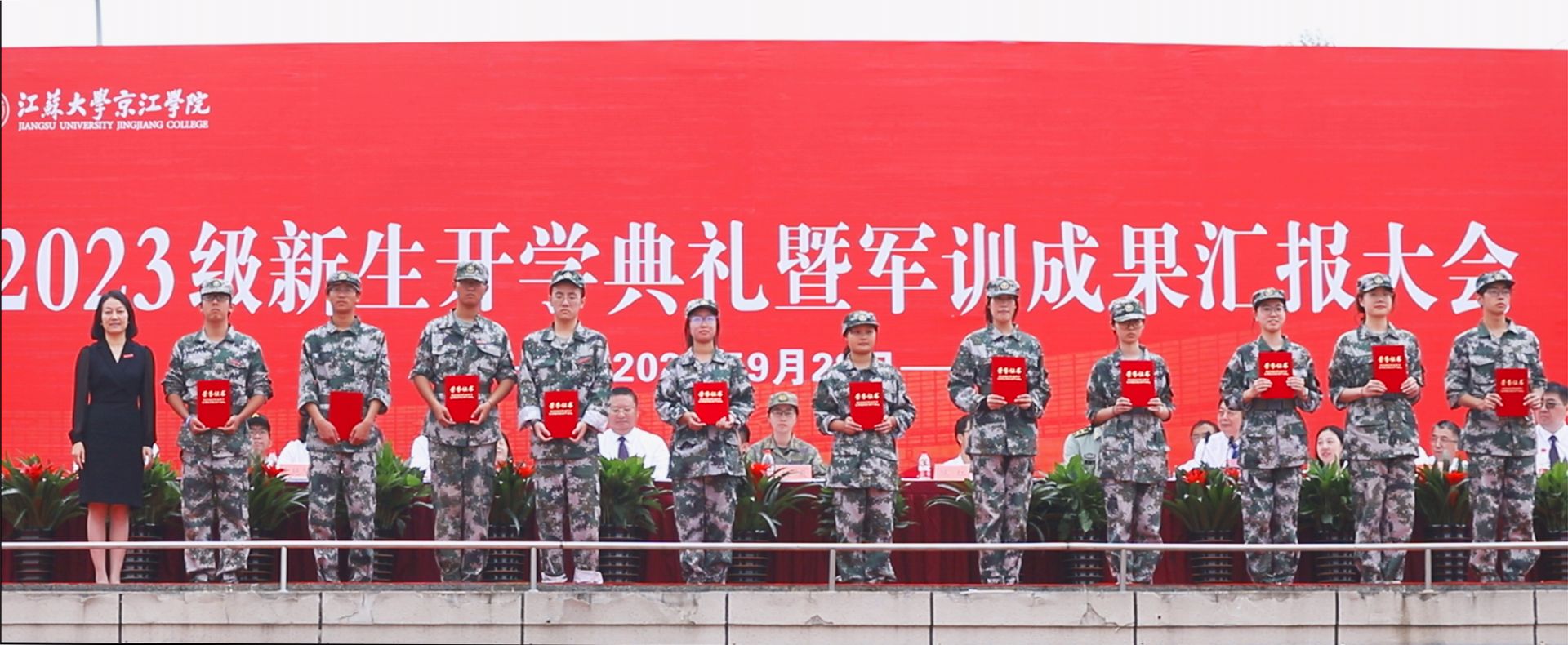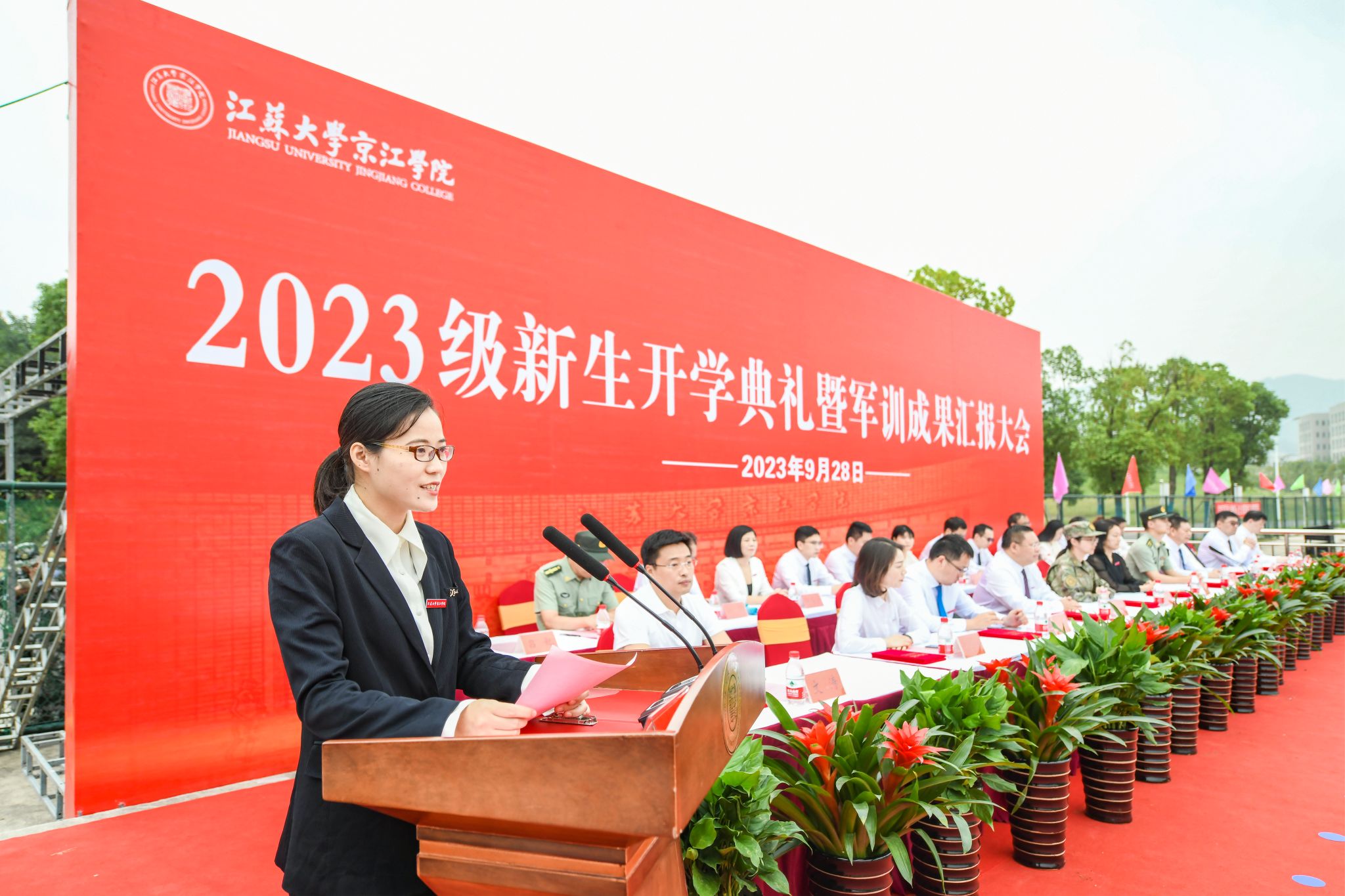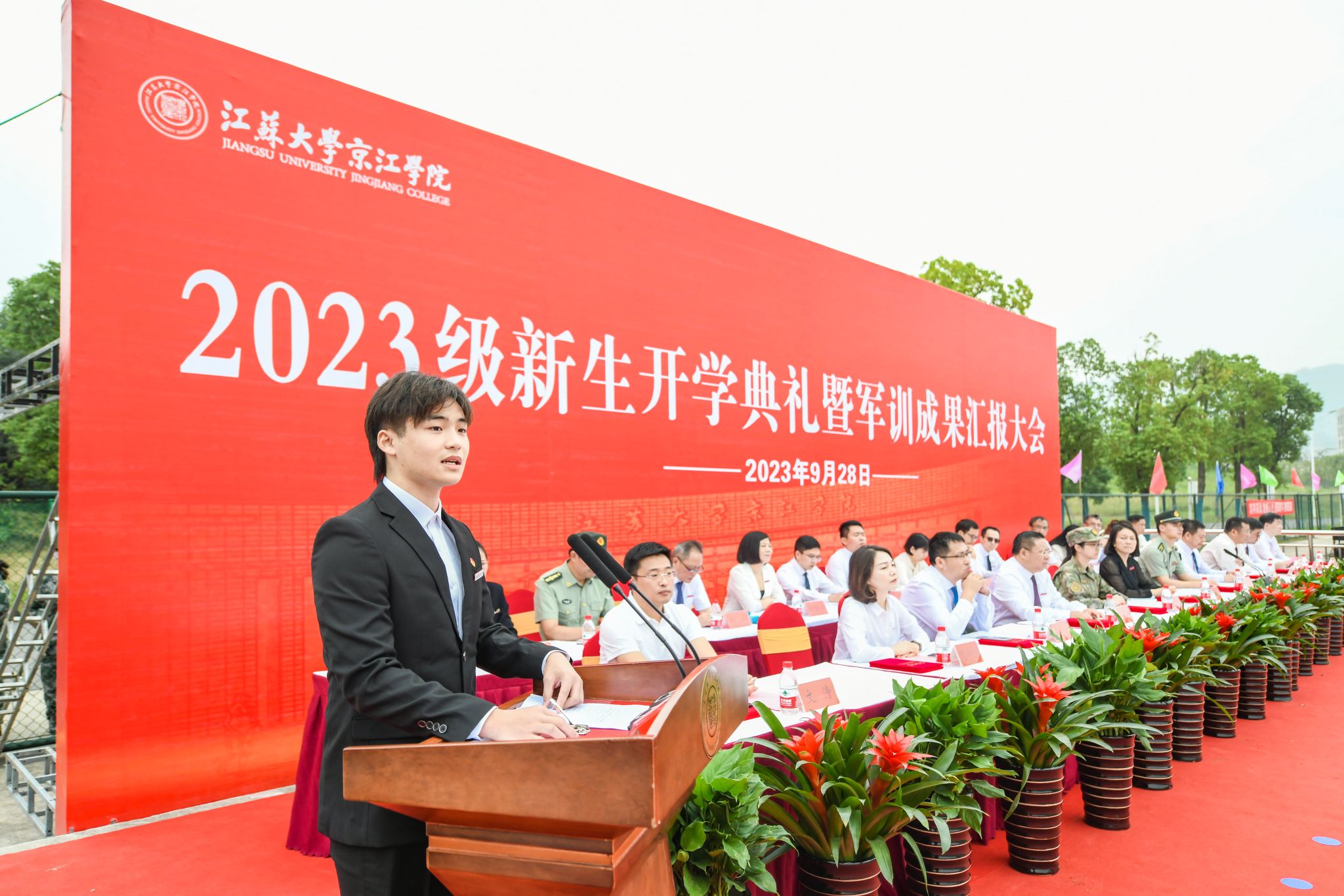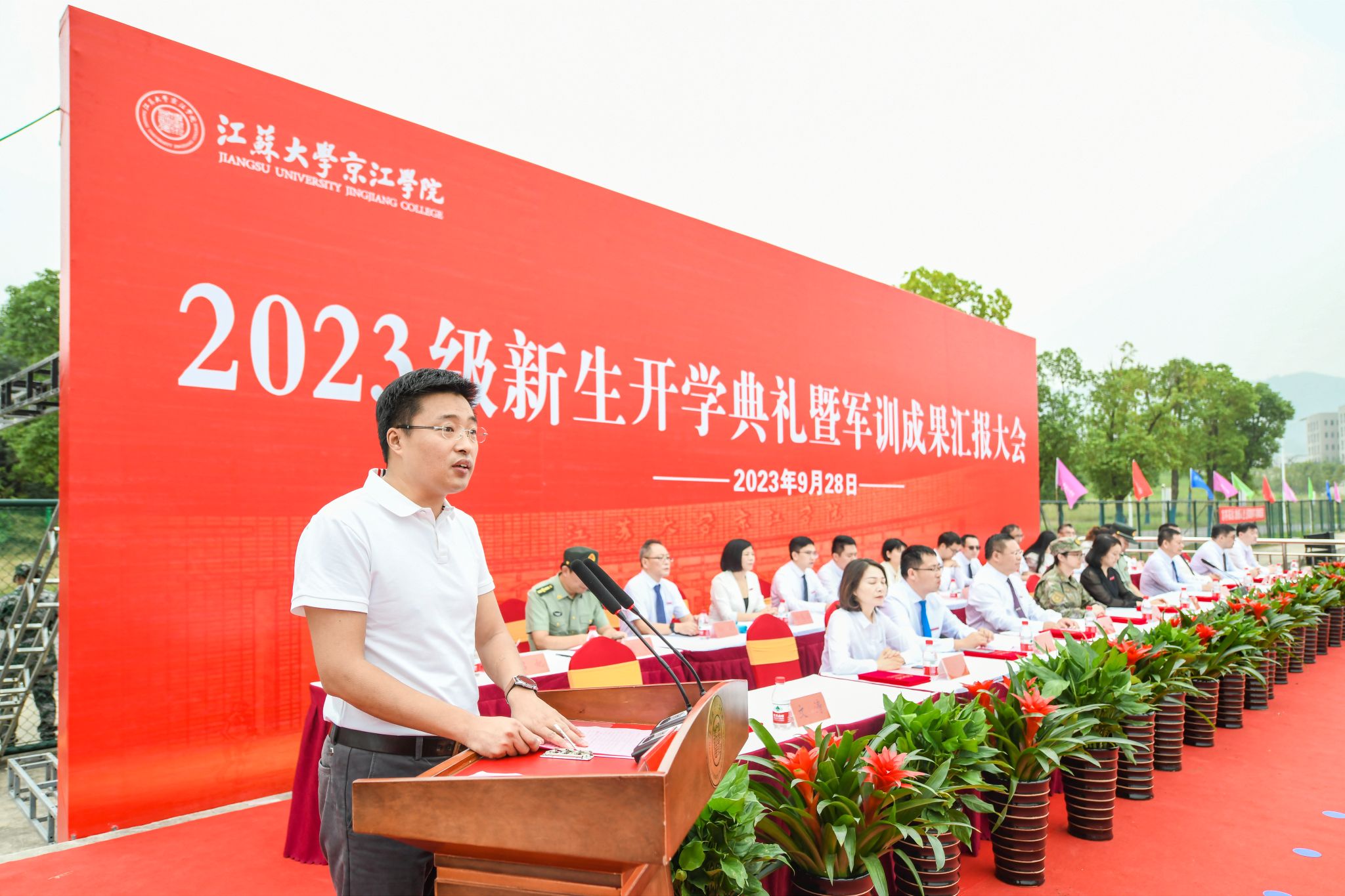 9月28日上午,江苏大学京江学院2023级新生开学典礼暨军训成果汇报会在京江操场举行。