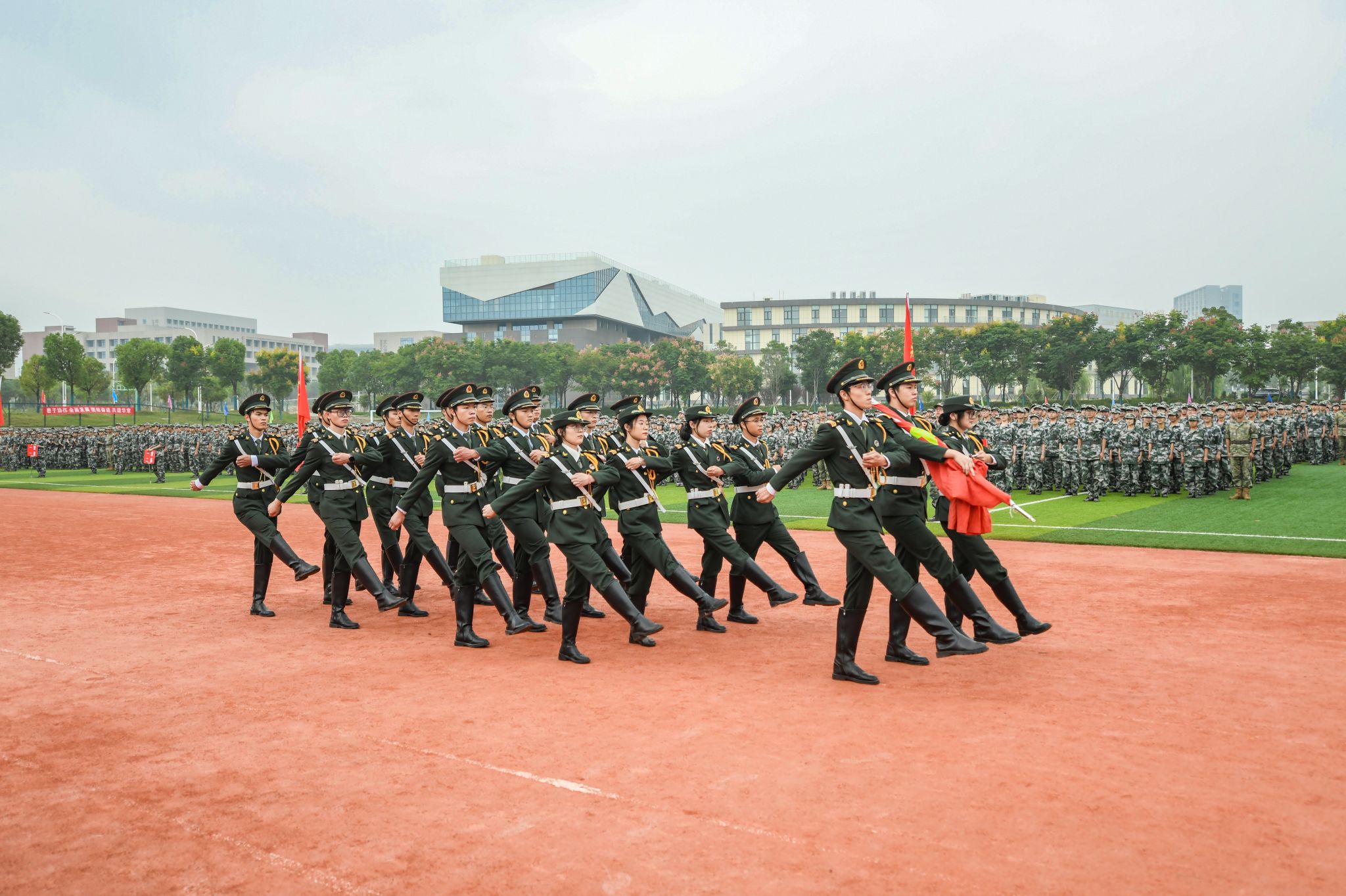 军训特色表演环节,战术进攻队形、军体拳和匕首操表演等军训特色课目依次汇报展示,他们动作整齐,士气高昂,赢得了现场阵阵热烈掌声。分列式环节,各方队精神抖擞、踏着铿锵有力的步伐依次通过主席台接受检阅。