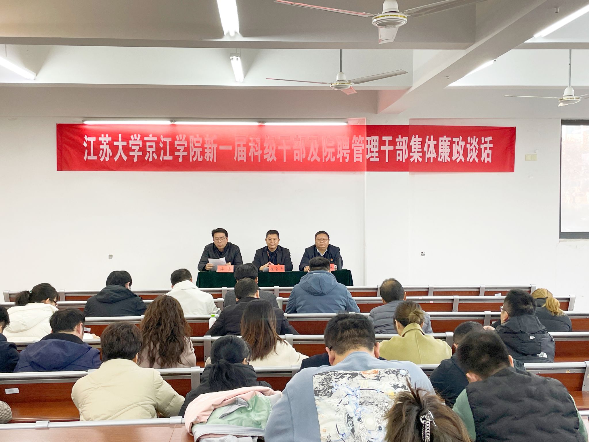 12月5日下午,京江学院召开新一届科级干部和院聘管理干部集体廉政谈话,学院党委书记崔金贵,院长杜道林,党委副书记、纪委书记蒋豪出席会议并分别讲话,学院新一届科级干部和院聘管理干部40余人参加了会议,会议由杜道林主持。