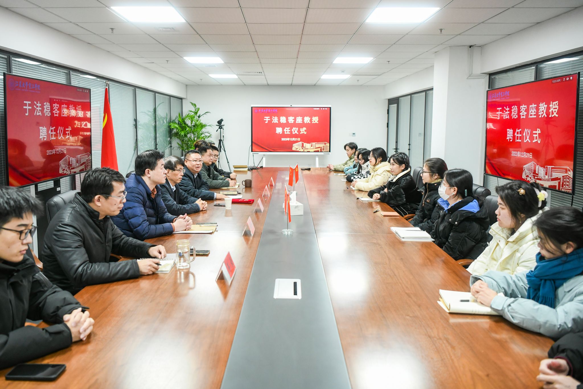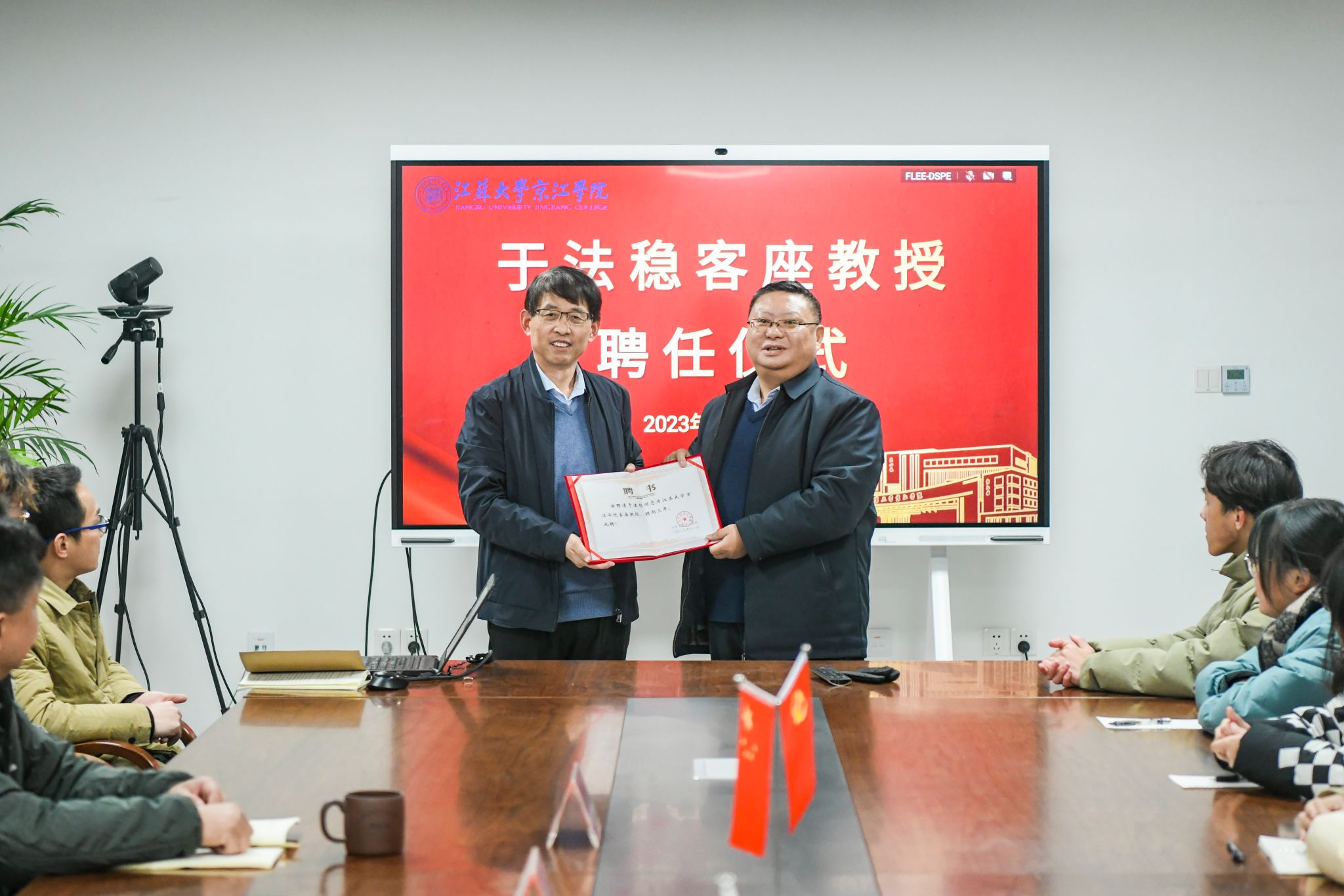 12月21日,京江学院在行政楼302会议室举行客座教授聘任仪式。中国社会科学院农村发展研究所生态经济研究室主任于法稳研究员受聘担任我院客座教授。杜道林院长主持仪式,副院长陈明军、李文新,党委副书记、纪委书记蒋豪,综合办公室、财经学院负责人,能源经济2023级部分同学参加仪式。