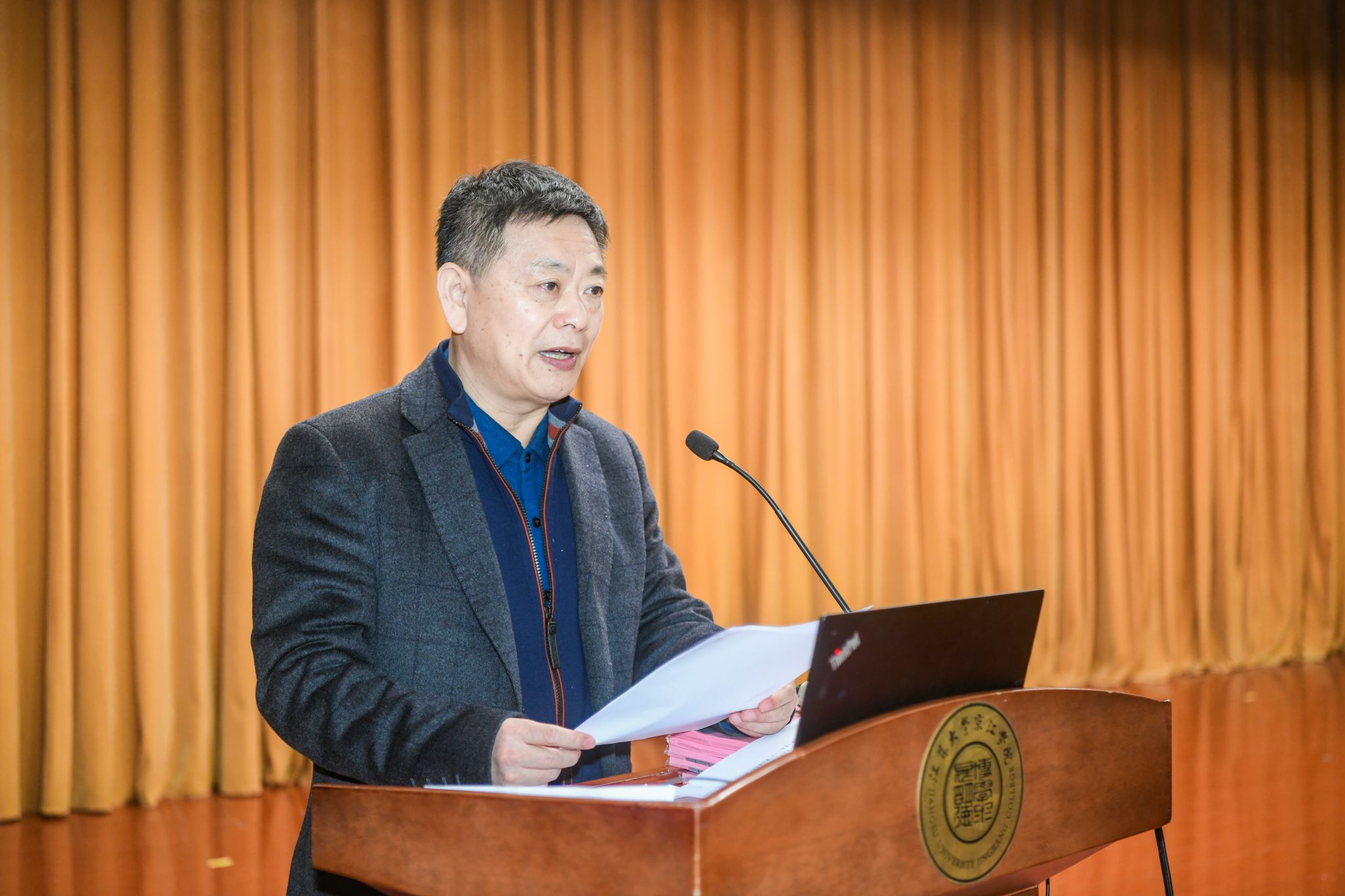 杜道林代表行政班子报告了学院2023年事业发展情况和取得的成绩,从人才培养、师资队伍、国际交流、学生工作、制度建设等方面进行了全面总结。
