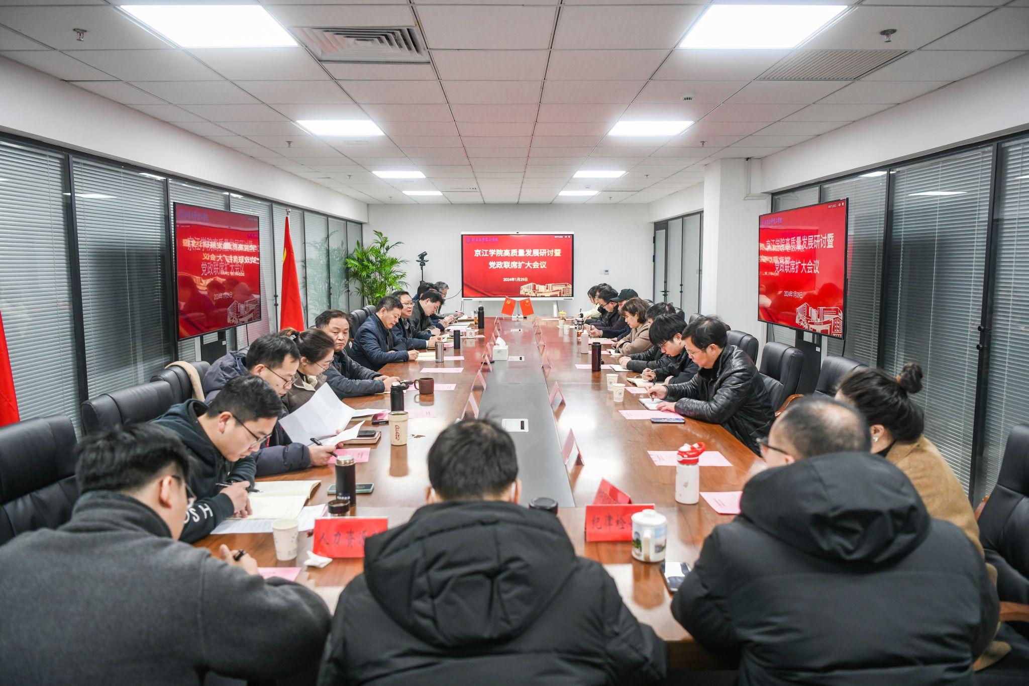 1月29日,京江学院在行政楼302会议室举行高质量发展研讨暨党政联席扩大会议。全体院领导、各二级单位负责人参加会议,会议由院长杜道林主持。