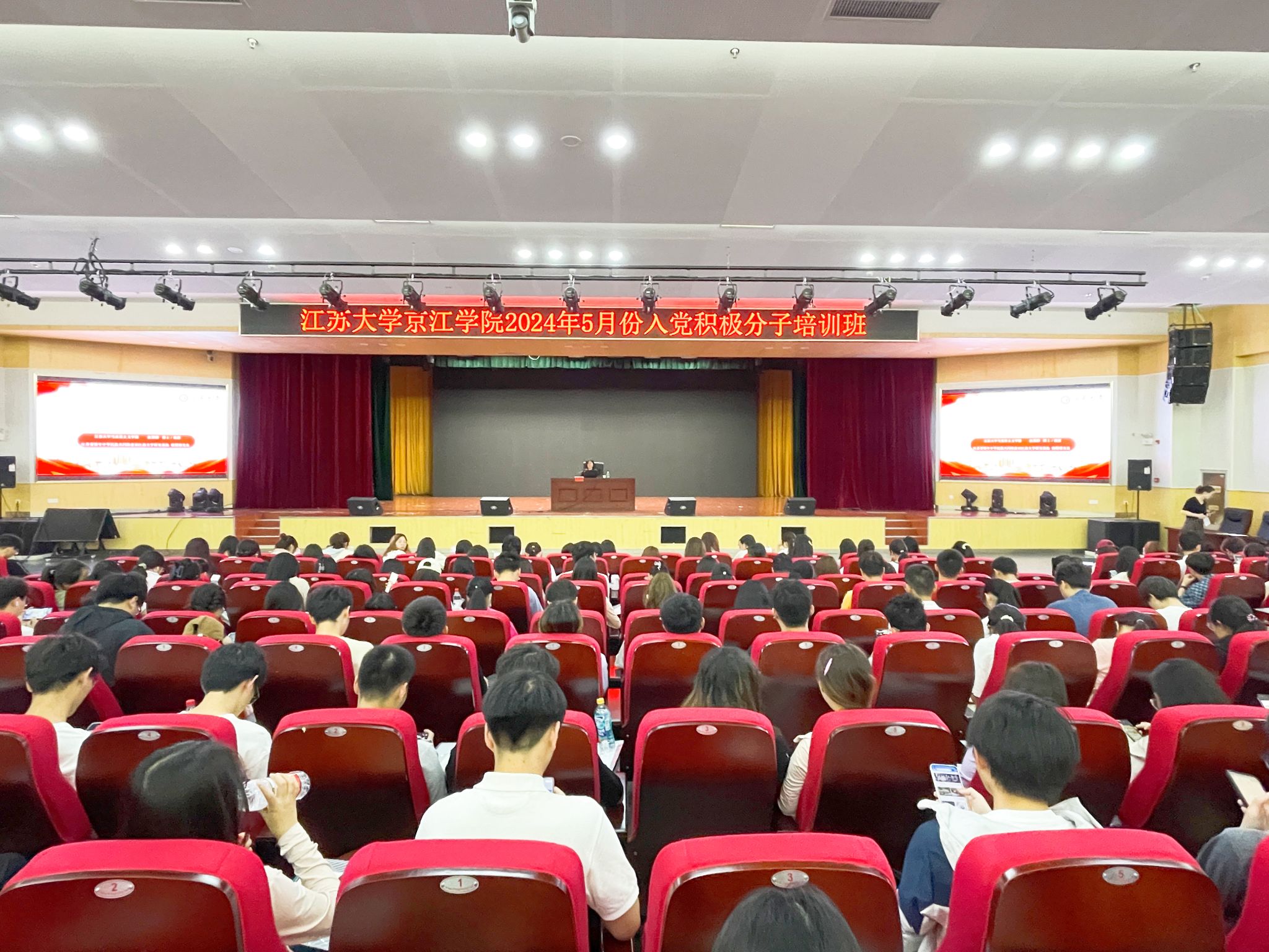 5月18日,京江学院分党校2024年上半年入党积极分子培训班在大学生活动中心多功能报告厅开班,300名入党积极分子参加学习培训。学院党委书记崔金贵,院长杜道林,学校党委宣传部副部长吴奕,马克思主义学院张慧卿教授分别为学员们授课。