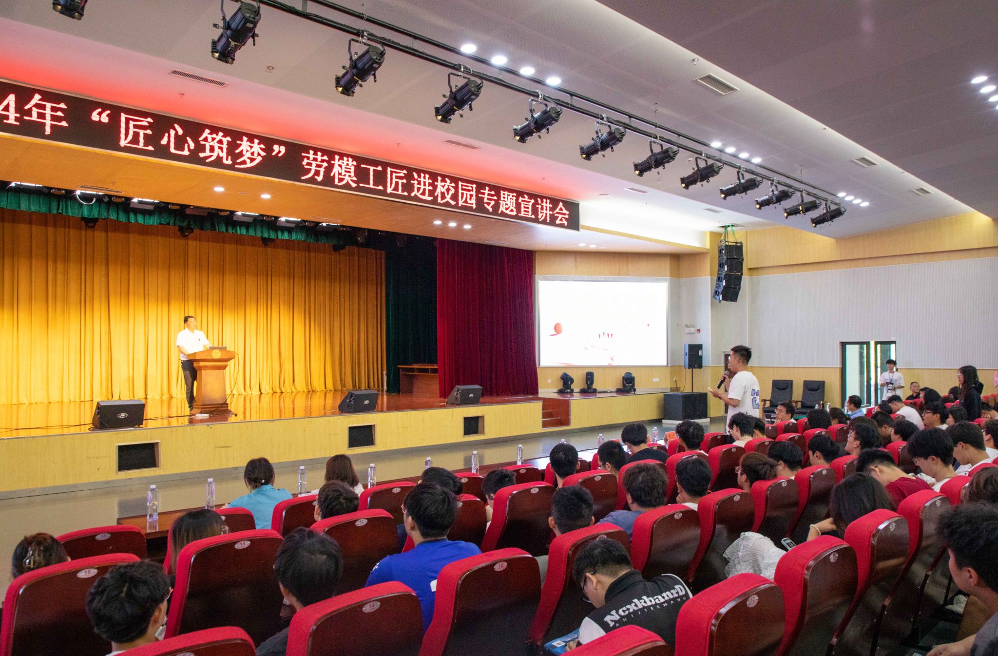 为深入学习贯彻习近平新时代中国特色社会主义思想,贯彻落实习近平总书记关于大力弘扬劳模精神、劳动精神、工匠精神的重要指示精神,全面加强新时代大学生劳动教育,进一步培育尊重劳动尊崇技术的文化土壤,奏响建功立业“劳动光荣、创造伟大”主旋律,5月29日下午,京江学院举办“匠心筑梦”劳模工匠进校园专题宣讲会,镇江市劳模工匠宣讲团成员,中共二十大代表、全国劳动模范、“江苏大工匠”、江苏广兴集团有限公司首席技师、总工程师沈春雷同志作为主讲嘉宾,给800余名师生带来了一堂生动的大思政课。活动由京江学院党委书记崔金贵主持。