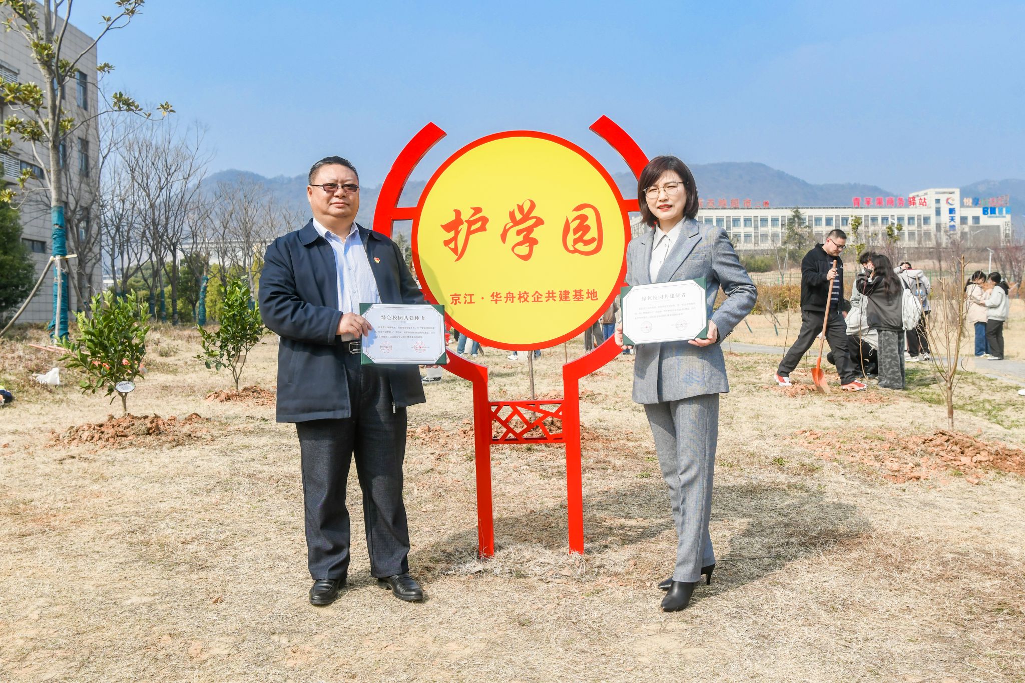 揭牌结束后,校企双方代表互换“绿色校园共建使者”荣誉证书。为绿色校园添砖加瓦,与师生携手共进,让校园四季皆景。