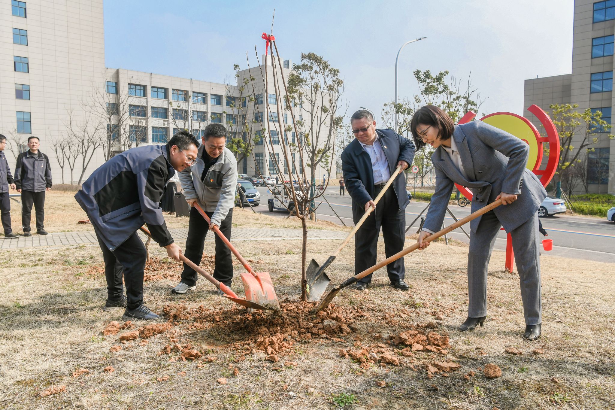 春回大地,万物复苏,在第47个植树节来临之际,江苏大学京江学院机关直属第二党支部与华舟物业管理有限公司举办“党旗领航植新绿,校企共建育新人”党建共建植树节活动。