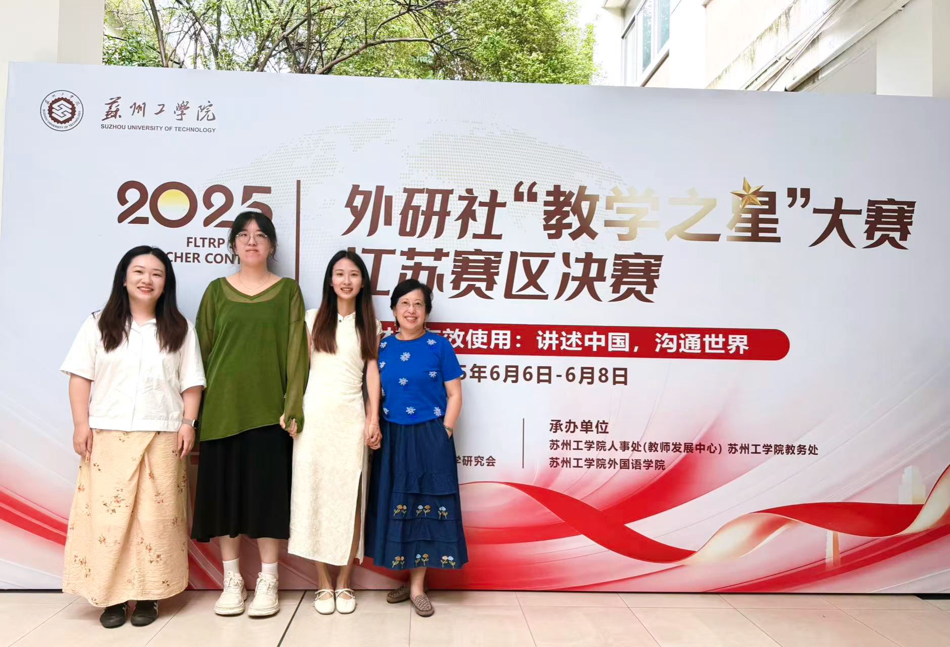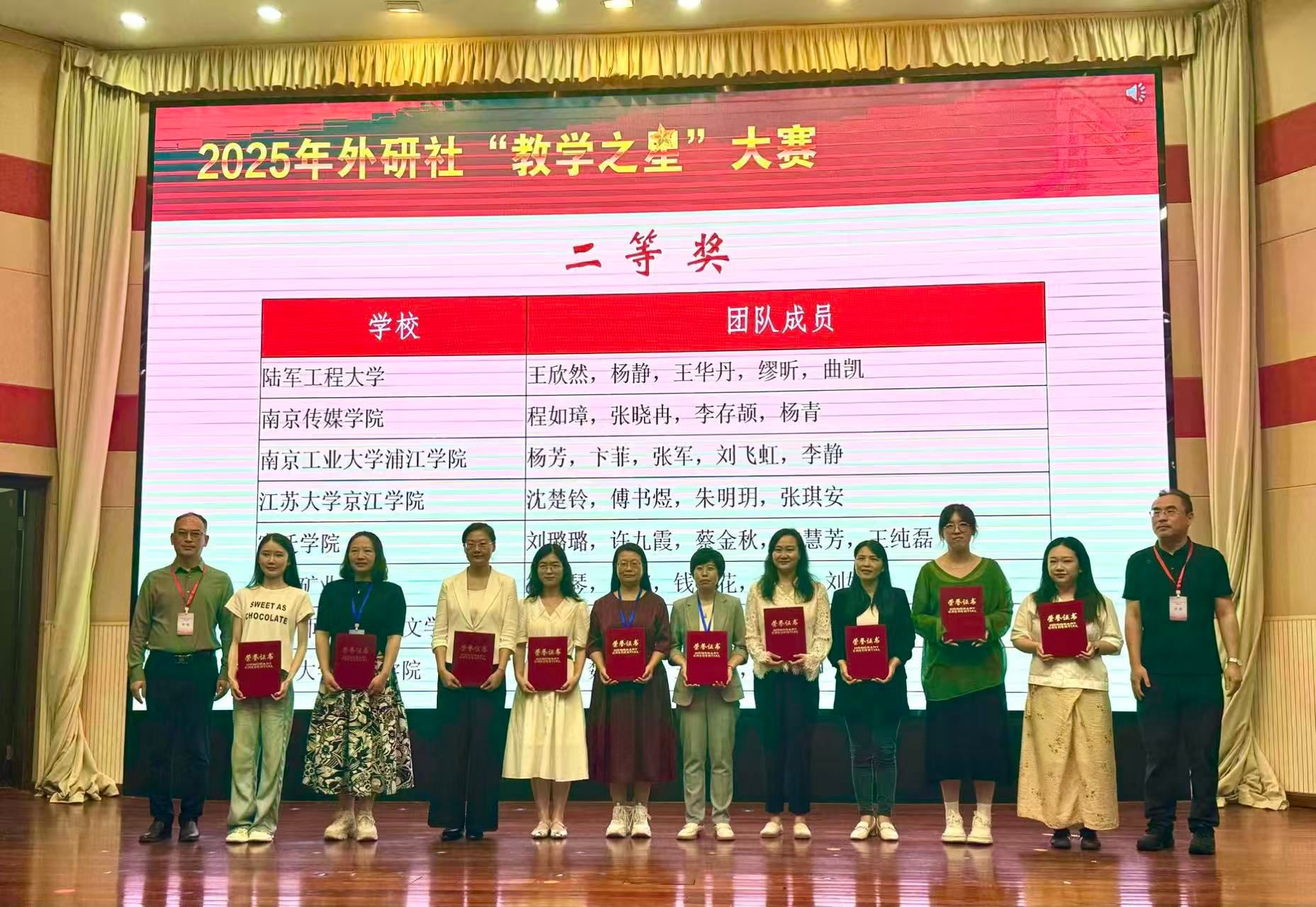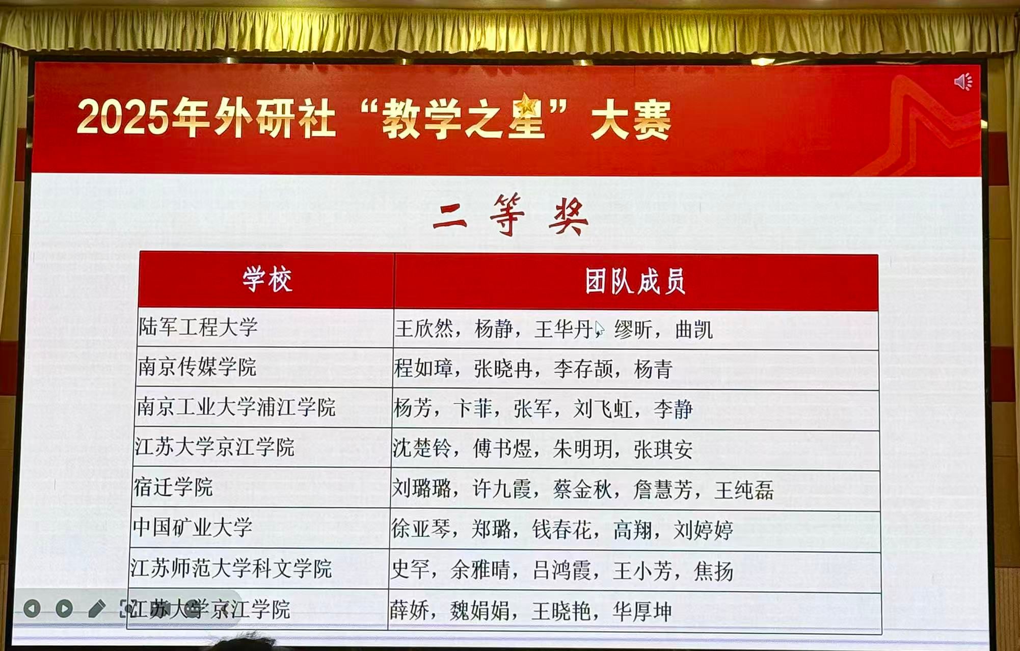近日,外研社2025年全国高校外语教师“教学之星”大赛江苏赛区总决赛在苏州工学院圆满落幕。作为全国高校外语教育领域极具权威性和影响力的大型赛事,此次大赛吸引了全省本科院校的40支精锐参赛团队齐聚一堂,展开激烈较量。京江学院大学英语组(沈楚铃、傅书煜、朱明玥、张琪安)凭借扎实的专业功底和出色的教学设计,斩获江苏省赛二等奖、全国复赛一等奖;英语专业组参赛团队(薛娇、魏娟娟、王晓艳、华厚坤)在比赛中表现出色,荣获江苏省赛二等奖、全国复赛二等奖。