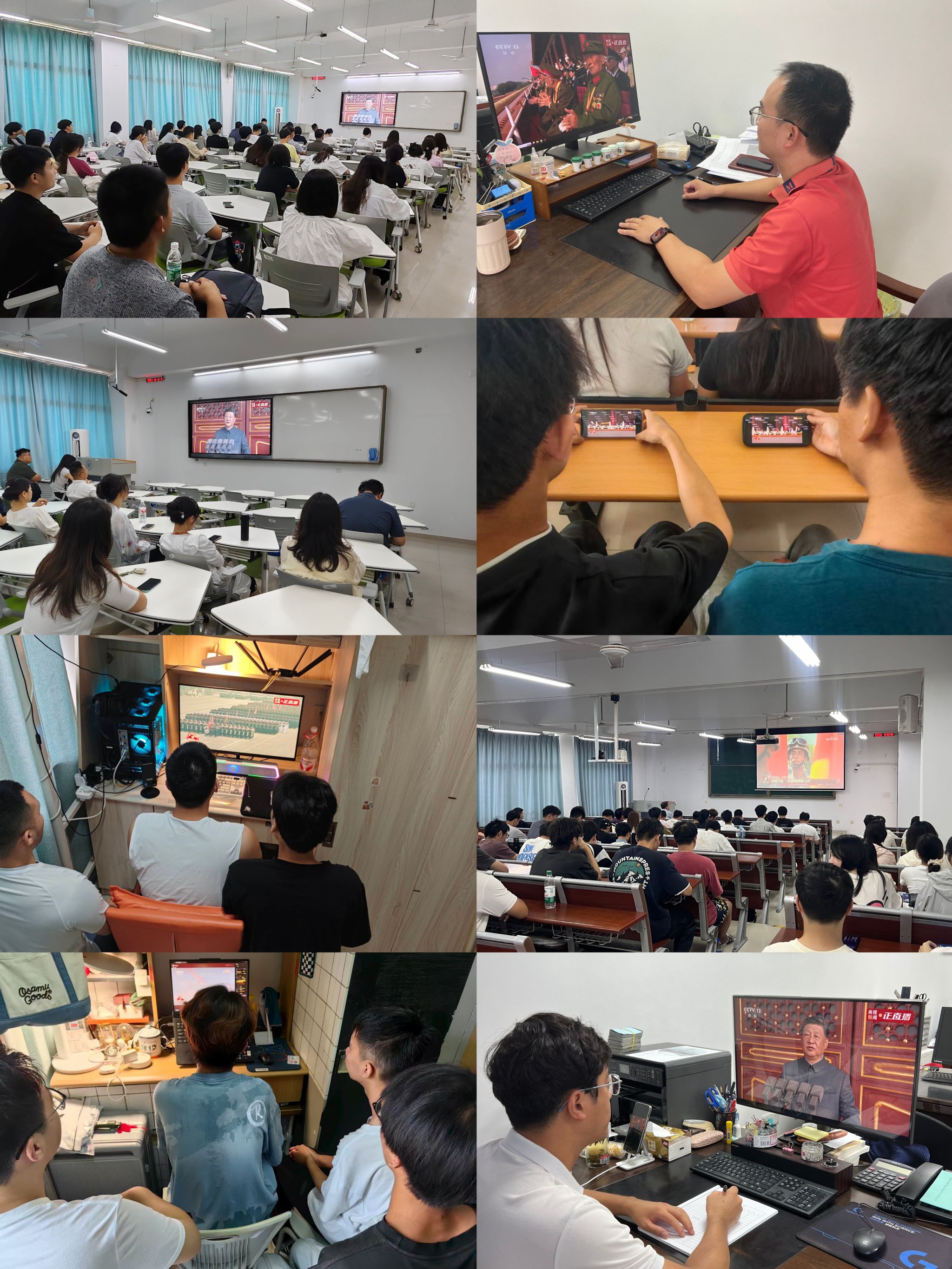 除了集中观看,部分同学选择在宿舍、教室通过个人设备观看大会。他们同样被阅兵的壮观场面所吸引,在宿舍里,同学们围坐在一起,一边观看一边交流感受;在教室里,独自观看的同学也沉浸在阅兵的庄严氛围中,为祖国的强大感到自豪。2024级王同学表示:“看到阅兵场上那些和我们年龄差不多的军人,挺拔的身姿、整齐的步伐,让我热血沸腾。我们要继承和发扬伟大的抗战精神,勤学修德、立志报国。”