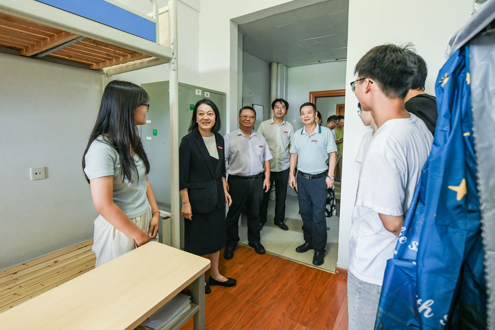 陈红一行来到迎新报到点,实地查看报到流程,详细了解新生到校情况,并亲切慰问现场工作人员。随后,陈红一行深入公寓看望新生,与同学们亲切交谈。她勉励同学们要互相关心、团结友爱,尽快完成角色转变,主动适应大学生活,积极融入京江学院这个温暖的大家庭;同时希望同学们珍惜大学时光,坚定理想信念,树立远大目标,勤奋治学,全面发展,努力成长为德才兼备、堪当大任的时代新人。同学们对校领导的关怀深表感谢,纷纷表示将牢记嘱托,以积极向上的姿态开启大学生活,不负青春、奋发进取。