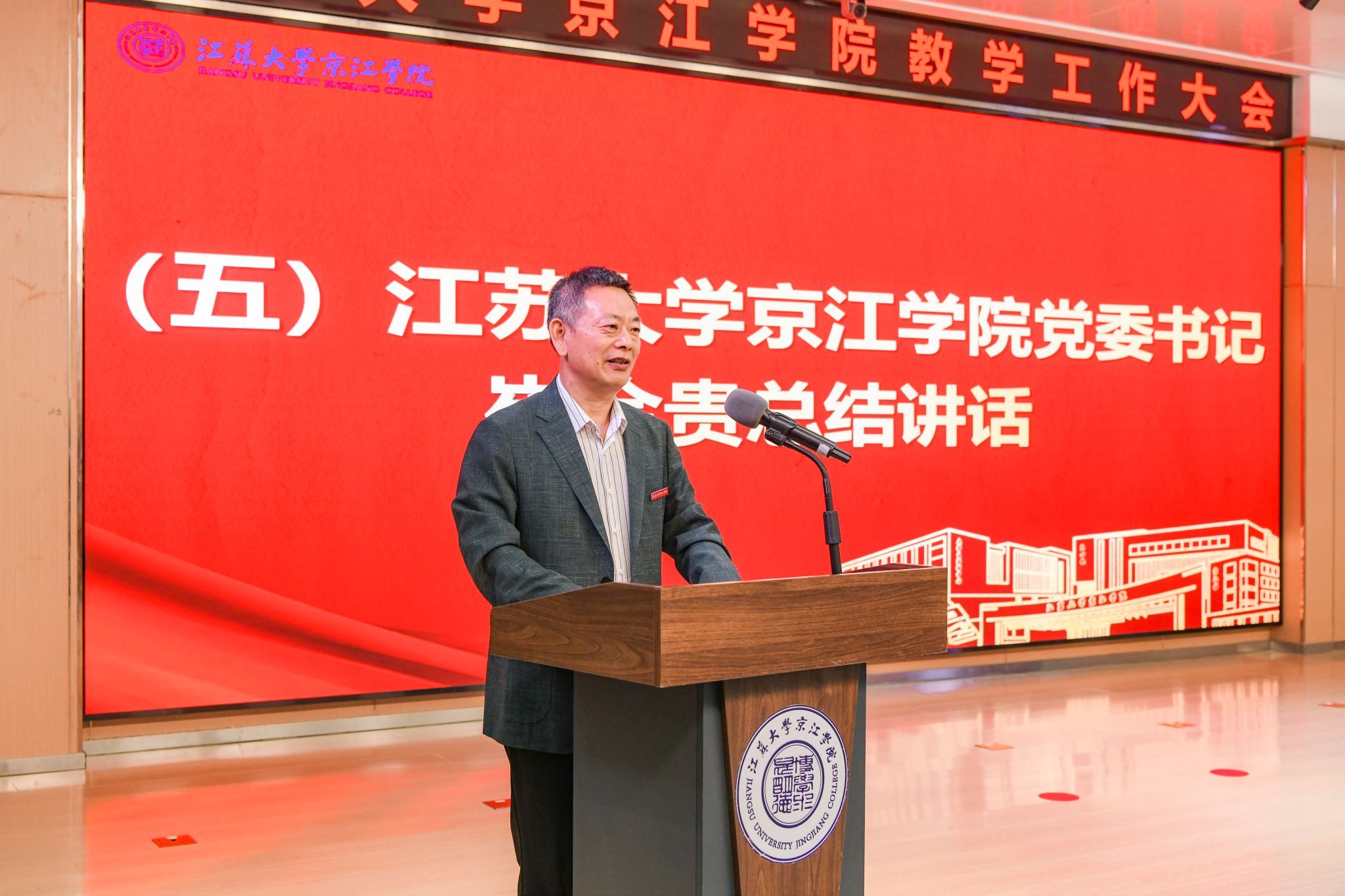 京江学院党委书记崔金贵总结讲话。他就京江学院教育教学工作提出了四点意见:一是锚定时代坐标,把握应用型人才培养的政策导向与现实要求;二是围绕立德树人根本任务,树立领军型应用人才育人理念;三是聚焦人才培养提质增效,深化本科教育教学改革;四是聚焦教书育人能力提升,打造高水平师资队伍。