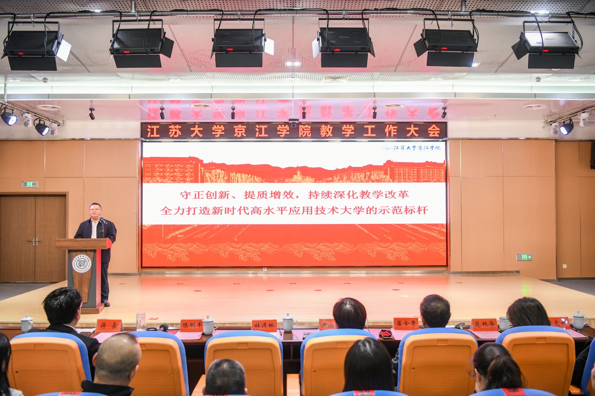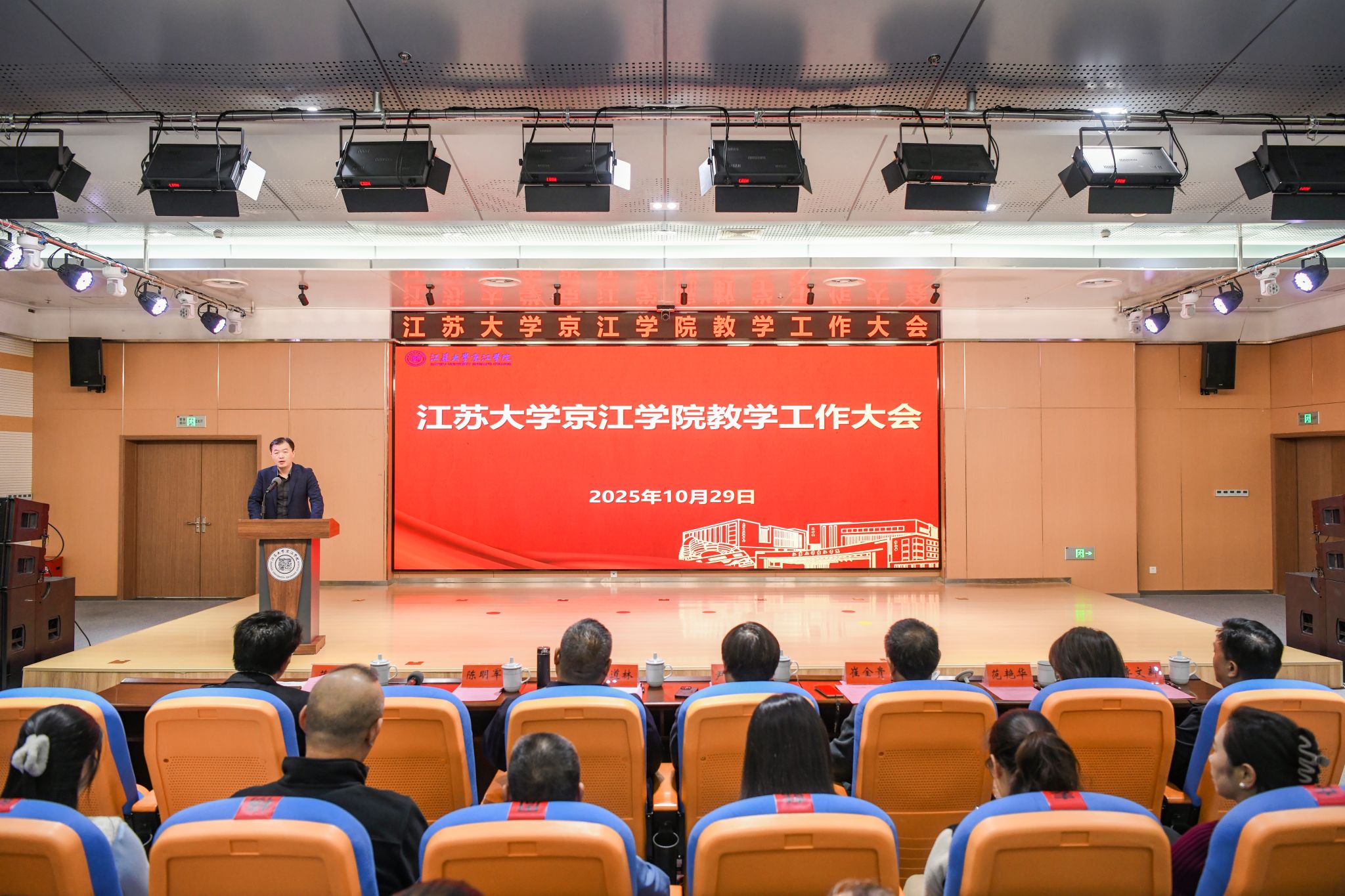为贯彻党的二十届四中全会和全国教育大会精神,进一步落实立德树人根本任务,科学制定“十五五”教学工作规划,有效提高京江学院教育教学水平和本科人才培养质量,10月29日,京江学院在学术交流中心第四报告厅隆重召开第一届教学工作大会。江苏大学教务处处长尹必峰、京江学院全体院领导出席会议,京江学院教学督导、全院教职工参加大会。大会由副院长陈明军主持。