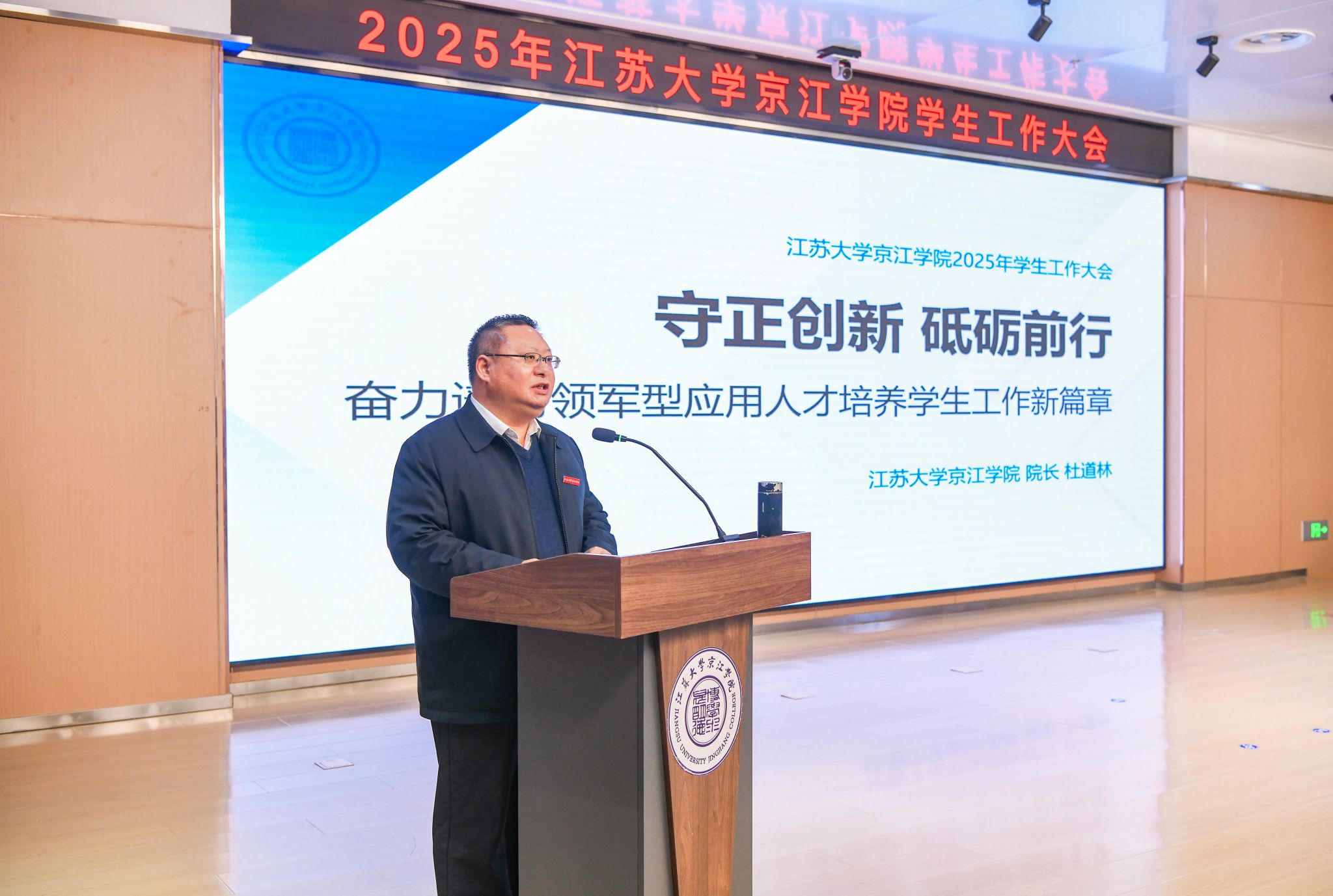 京江学院院长杜道林作了题为《守正创新 砥砺前行 奋力谱写领军型应用人才培养学生工作新篇章》的工作报告。报告系统梳理了过去一阶段京江学院在学生工作方面取得的成绩,深入剖析了当前面临的挑战与机遇,并对下一阶段学生工作的开展提出了明确思路与实施路径。
