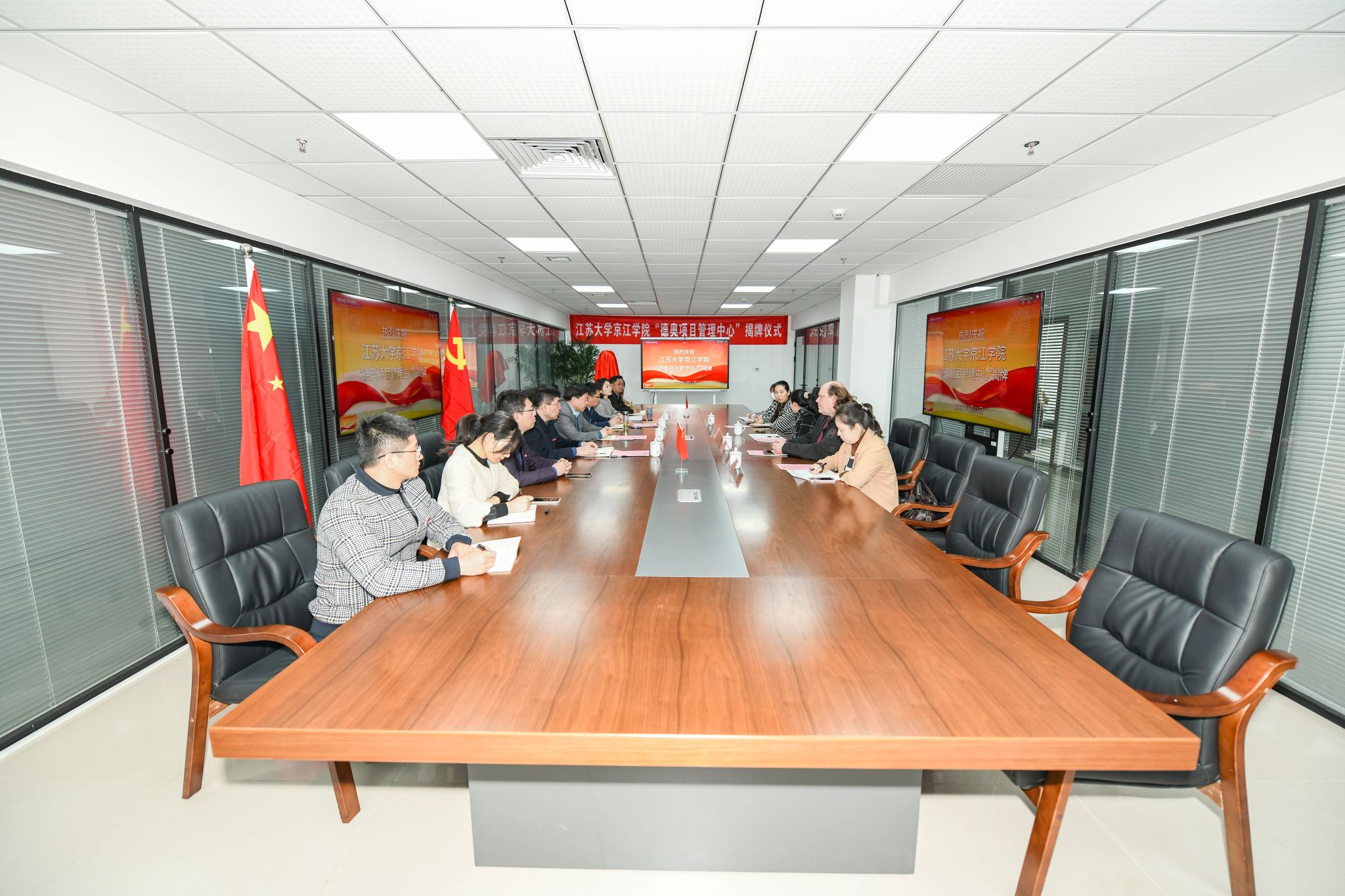 为推进学院国际交流合作的发展,拓宽师生升学、进修渠道,3月11日,我院在行政楼302会议室举行“江苏大学京江学院德奥项目管理中心”揭牌仪式。无锡洛匠教育科技有限公司总经理唐小娟,副总经理孙嫣、华羚惠,德国TSE集团总经理MATTHIAS GERHARD KREUZER(Matt),我院院长赵喜仓,党委副书记、副院长吴立平,党委副书记、纪委书记陈立勇,副院长范艳华以及综合办公室、学生工作部的相关老师出席了揭牌仪式。仪式由范艳华主持。