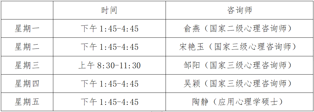 为进一步强化我院大学生心理健康教育工作,广泛有效地开展大学生心理咨询活动,及时处理学生心理困惑,全面提升我院大学生的心理素质,现将心理访谈室工作时间相关事宜通知如下,同时请相关心理咨询师按照要求做好咨询工作,共同营造积极健康向上的校园环境。