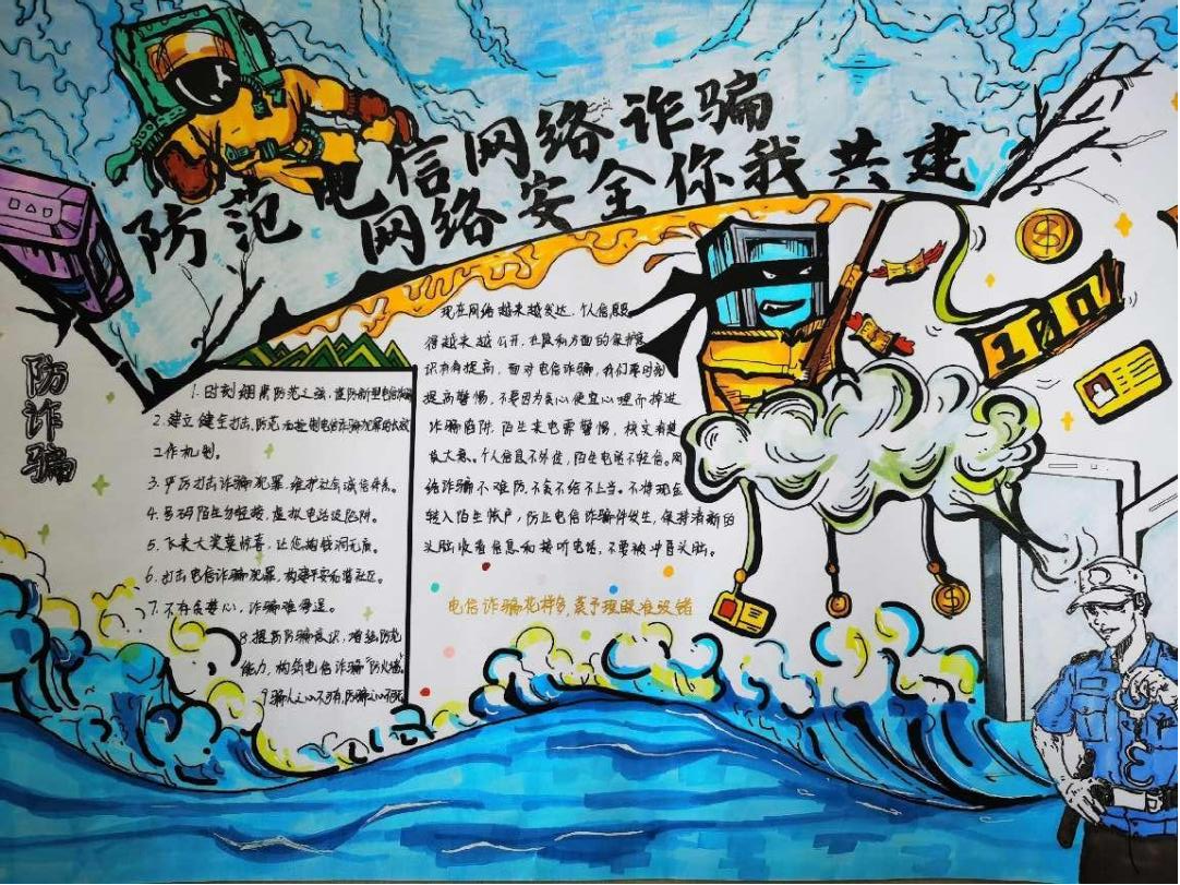 为了进一步增强学生反诈意识,提高识别和预防诈骗能力,引导学生积极参与防范电信网络诈骗宣传,我校近日专门组织举办“防范电信网络诈骗,网络安全你我共建”主题手抄报设计大赛活动,广大学生积极参与报名并投稿,共收到参赛作品87件,经过评委认真评选,最终选出一等奖作品7件、二等奖作品15件、三等奖作品20件。