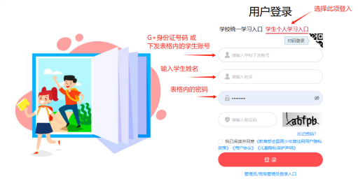 输入学生账号(G+身份证号或附录表格内的学生账号)、初始密码(详见附录表格)、姓名。