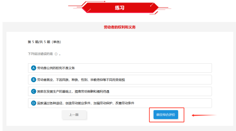 ②完成两个板块后,在底部【学习练习】中点击【前往综合评价】,在页面中点击【综合评价】,完成后可在综合评价页面查看“宪法卫士”标识。