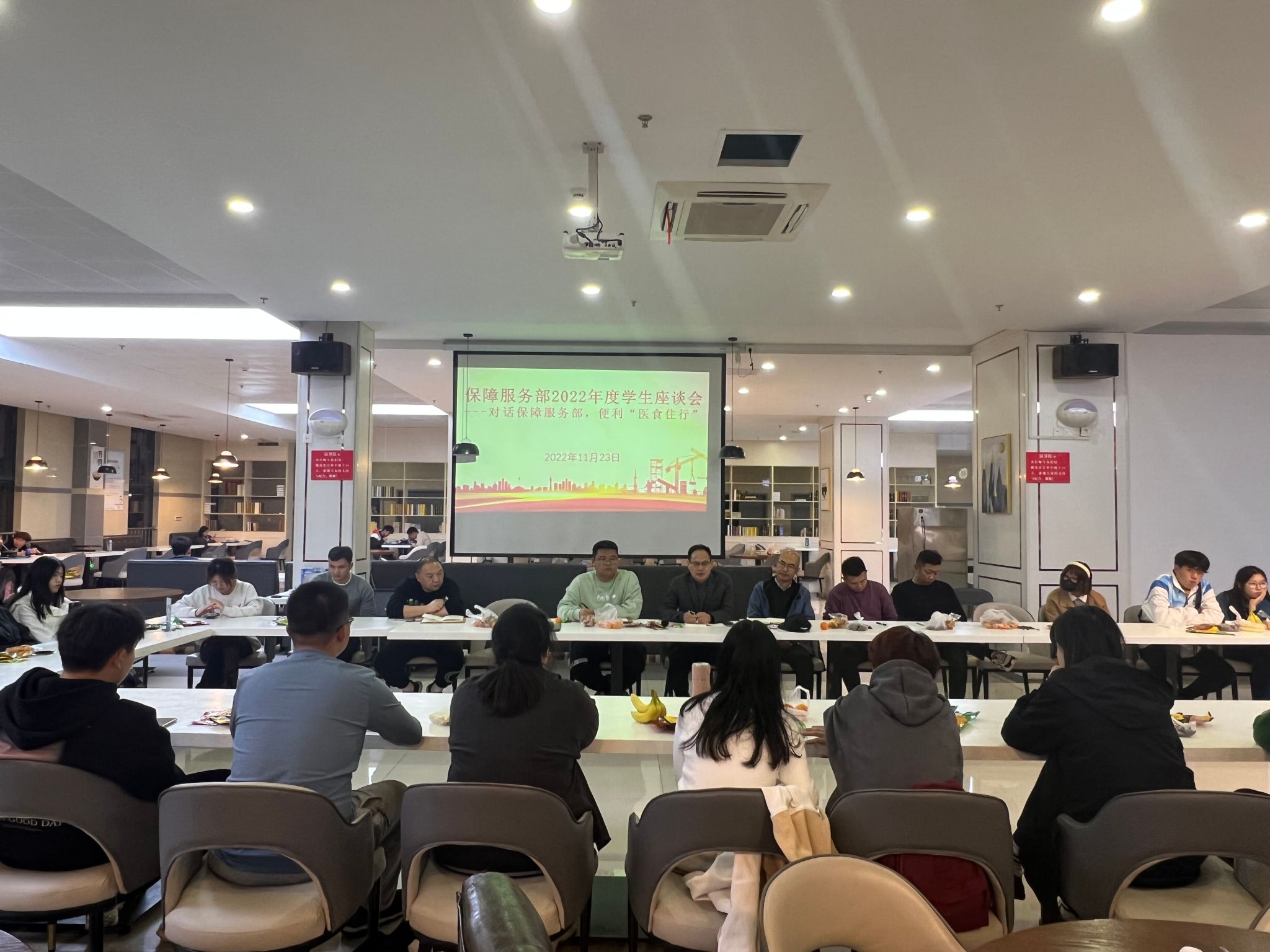 为搭建学生与学校后勤服务面对面交流的桥梁,11月23日,我校在二食堂三楼举办“对话保障服务部,便利医食住行”学生座谈交流会。保障服务部负责人,食堂、物业、安保、校医务室、经营商户等相关负责人及学生代表进行了交流。