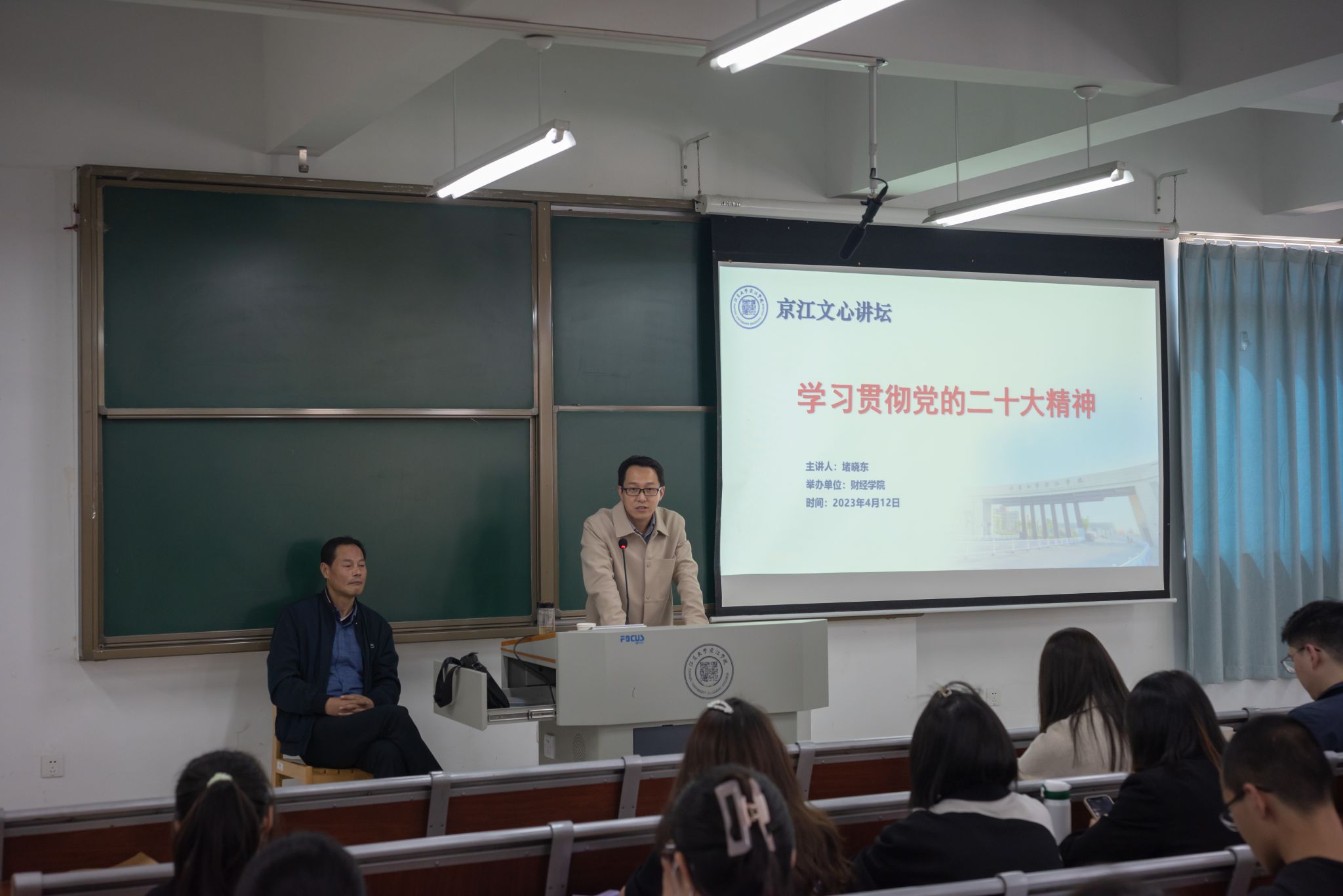 4月12日,财经学院在京江楼A110举办“京江文心讲坛”。本次讲坛邀请江苏大学马克思主义学院副教授堵晓东做题为“擎旗奋进新征程,踔厉奋发谱新篇——学习贯彻党的二十大精神”讲座。财经学院教师代表、“学生党员先锋队”成员、入党积极分子参会,活动由财经学院党总支书记高伏康主持。