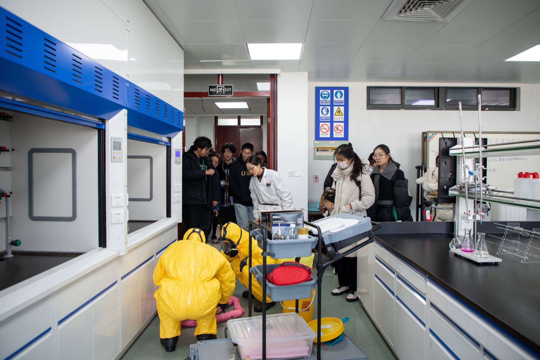 根据《省教育厅关于开展2023年高校实验室安全现场检查暨“回头看”工作的通知》(苏教办科函〔2023〕14 号)等文件要求,为进一步落实京江学院实验室安全管理工作,12月26日,京江学院在躬行楼化学实验中心组织开展危险化学品泄漏应急处置和疏散演练。京江学院副院长陈明军,综合办公室、教学工作部、保障服务部等职能部门负责人,化学实验中心工作人员以及40余位学生代表参加了演练。