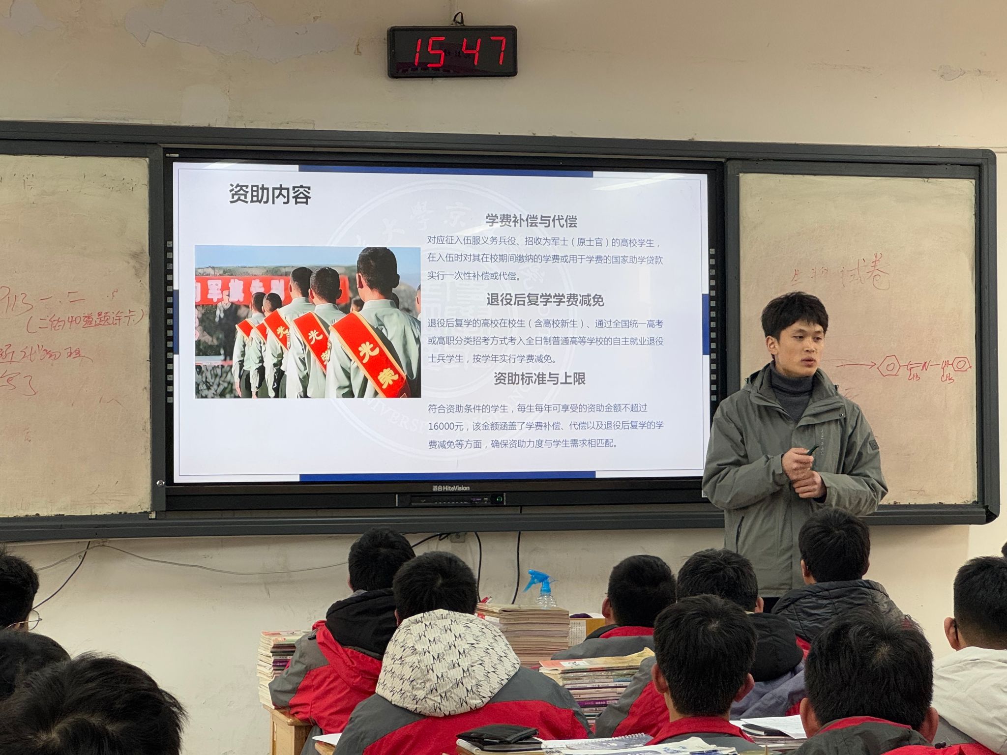 京江学院崔竞超同学退役复学后享受到多项国家资助政策,他结合自身受助经历,详细解读了国家在大学教育阶段的各项资助政策。从国家奖学金的激励,到助学金的帮扶;从助学贷款的支持,到学费减免的优惠;从勤工助学的机会,到校内资助的温暖,再到绿色通道的便捷,每一项政策都如同火种,点燃了在场学生们心中的希望。