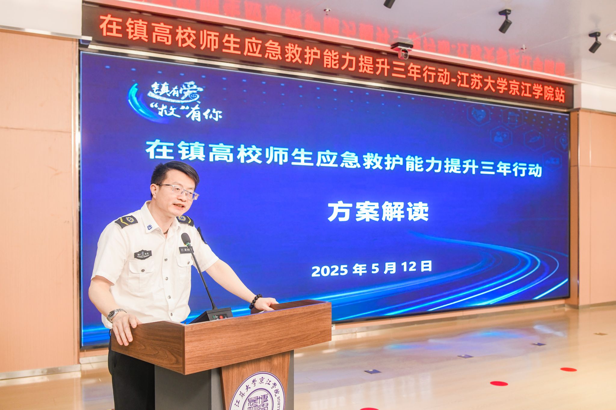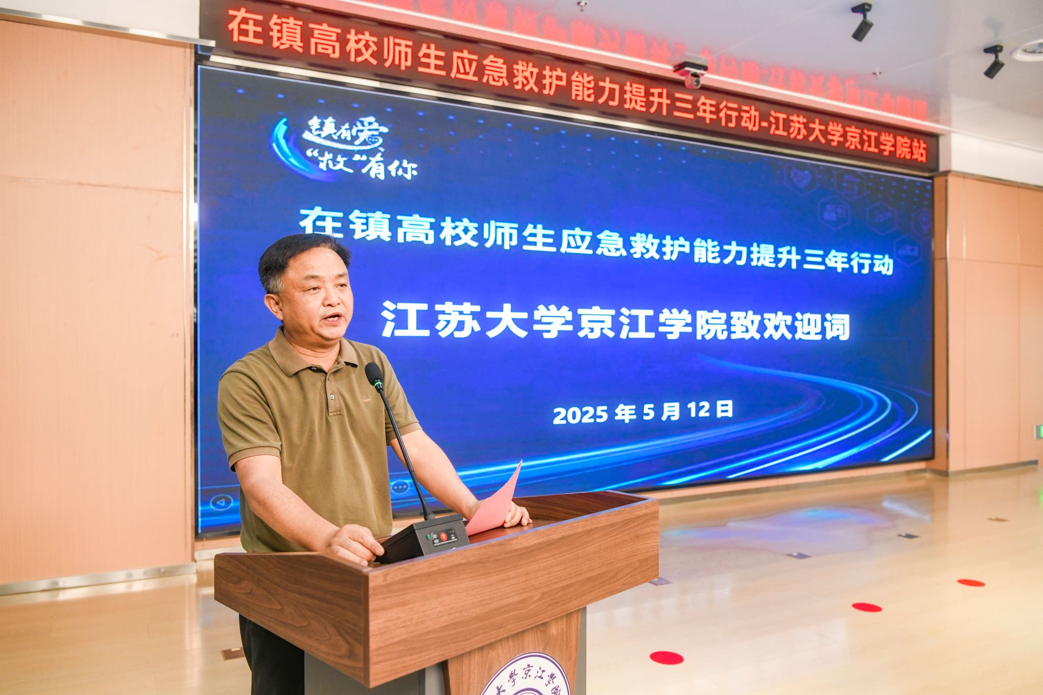 活动在京江学院副院长李文新的致辞中拉开帷幕。他强调,防灾减灾与应急救护是校园安全的重要组成部分,此次活动是落实“人人讲安全、个个会应急” 理念的具体实践,希望师生以学促行,将急救知识转化为守护生命的能力。