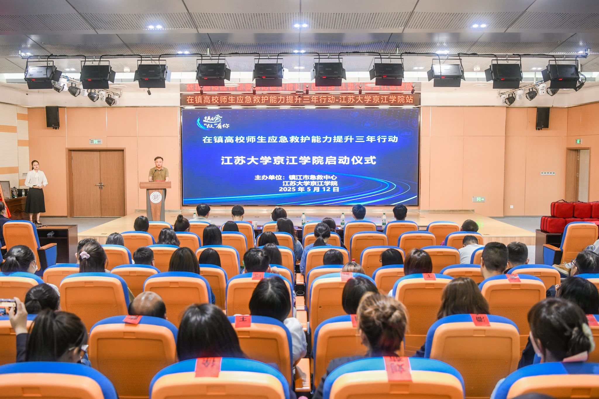 为增强师生防灾减灾意识,提升应急救护能力,5 月 12 日下午,江苏大学京江学院联合镇江市急救中心在一号楼第四报告厅举办“2025 年全国防灾减灾日”暨“镇有爱・‘救’有你”急救进高校活动。镇江市急救中心主任蒋韵、副主任黄晓云,京江学院副院长李文新、保障服务部相关负责人及100余名师生代表参与活动。