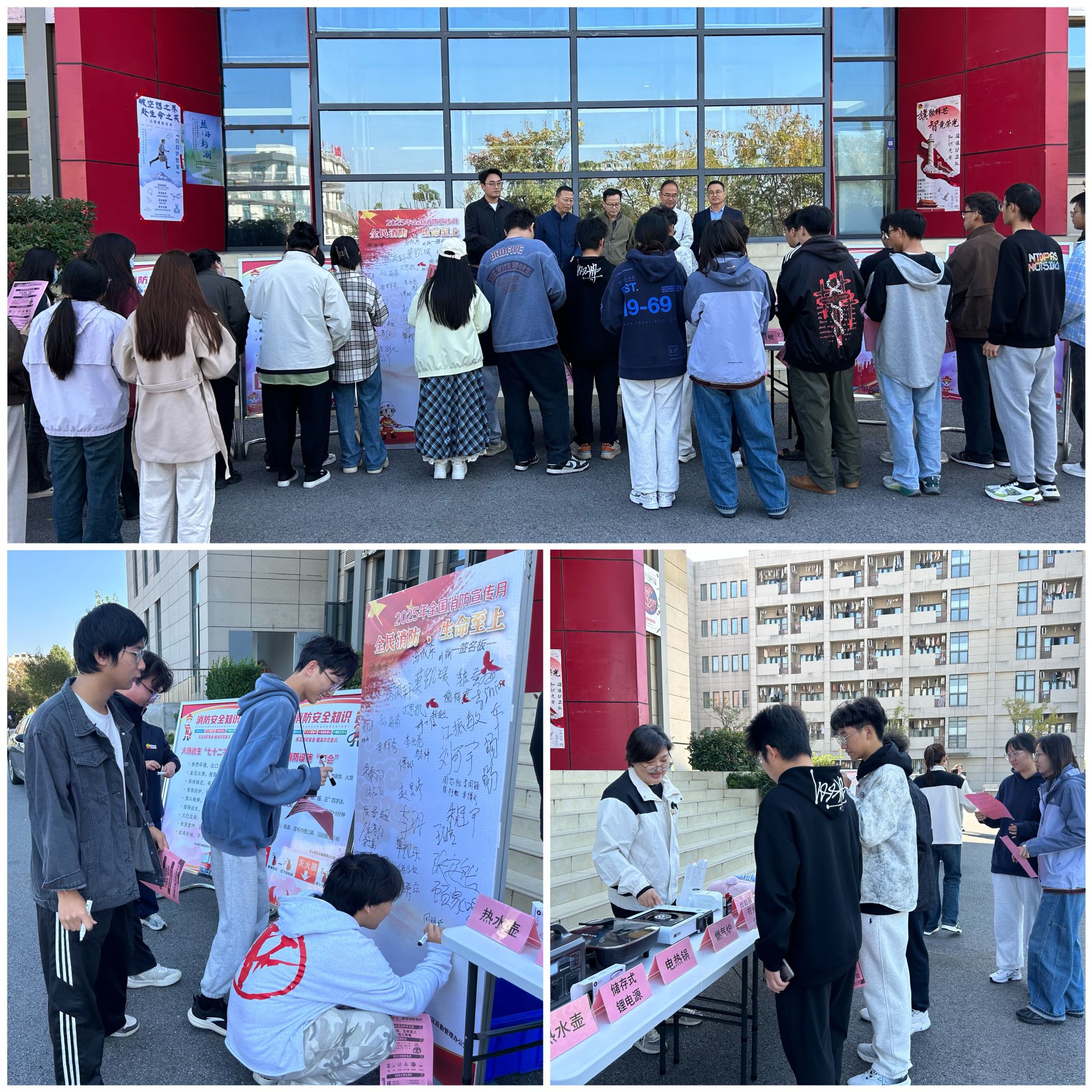 11月5日上午,京江学院第一食堂举办了消防安全现场宣传活动。活动现场精心布置了消防安全知识宣传展板,集中展示了学生公寓常见的违章电器,并向过往师生发放校园防火与安全用电宣传资料。活动还设置了“消防安全承诺签名板”,吸引了广大师生踊跃签名。