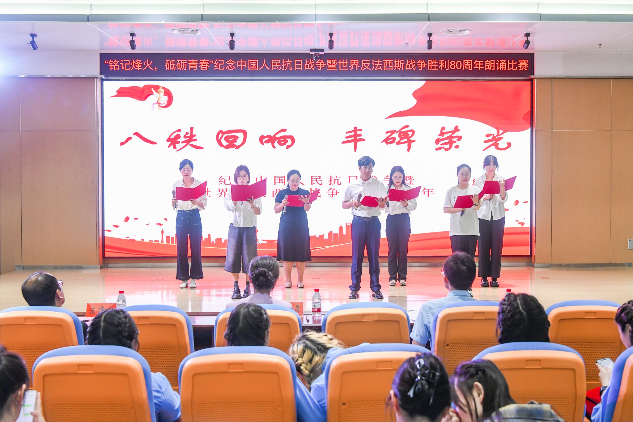 本次比赛吸引了来自全院各单位的8支师生团队同台竞技。各参赛队伍依次登台,倾情演绎了《山河永念 盛世如愿》《不屈的丰碑 复兴的征程》《八秩回响 丰碑荣光》《民族的丰碑》《那一抹红》《青春中国》《那束光》《不朽》等一系列主题鲜明、内涵深刻的朗诵作品。